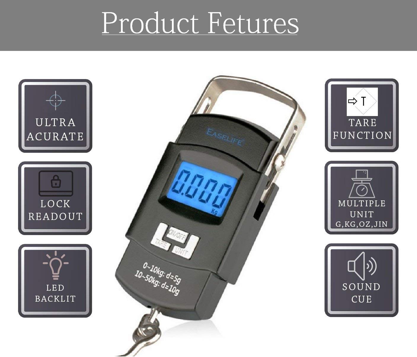 • Features a newly enlarged weighing hook finished in die-cast metal, and 3 large buttons ( on/off, unit, tare ) that generate an audible select confirmation. Cleans and stores easily