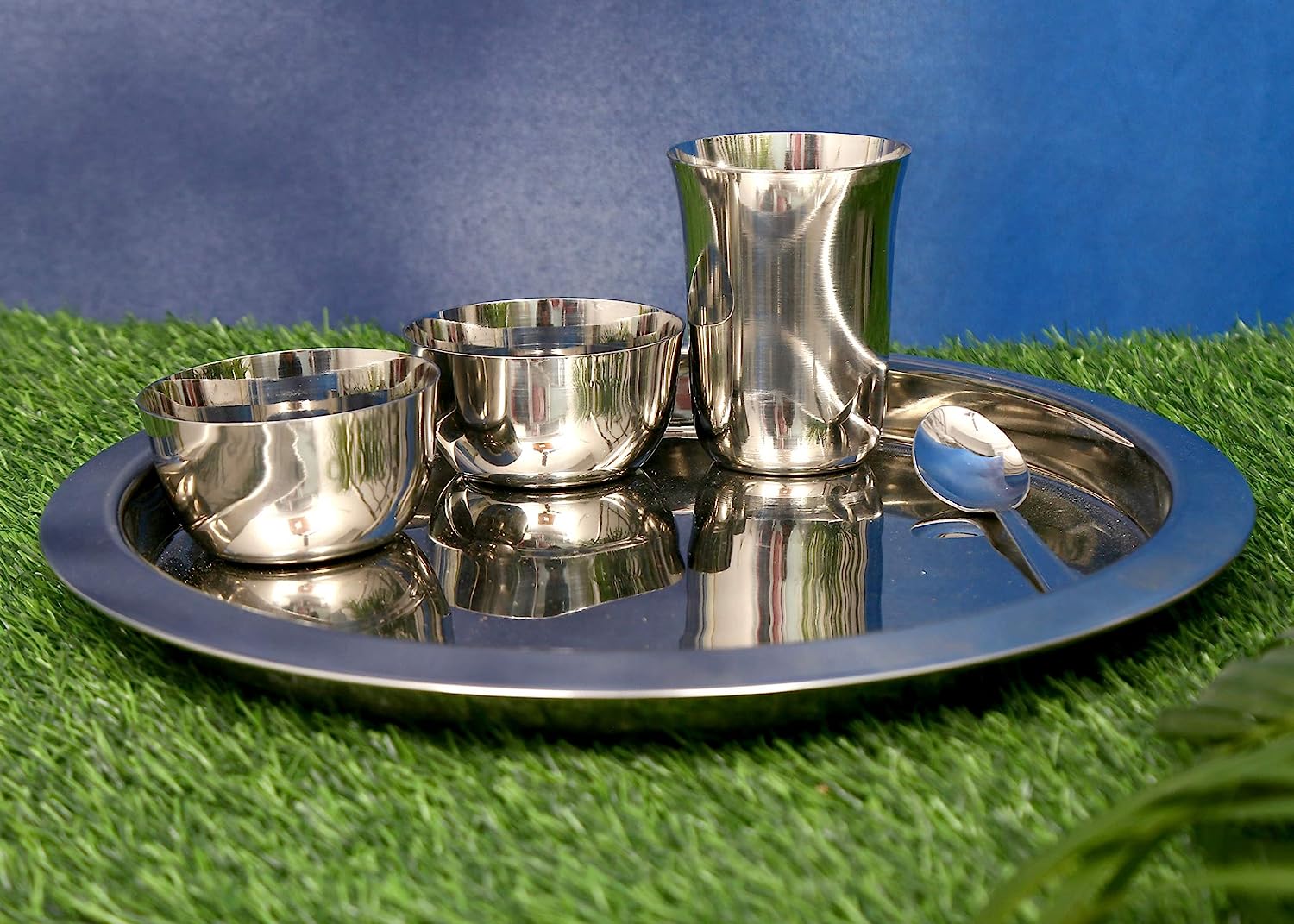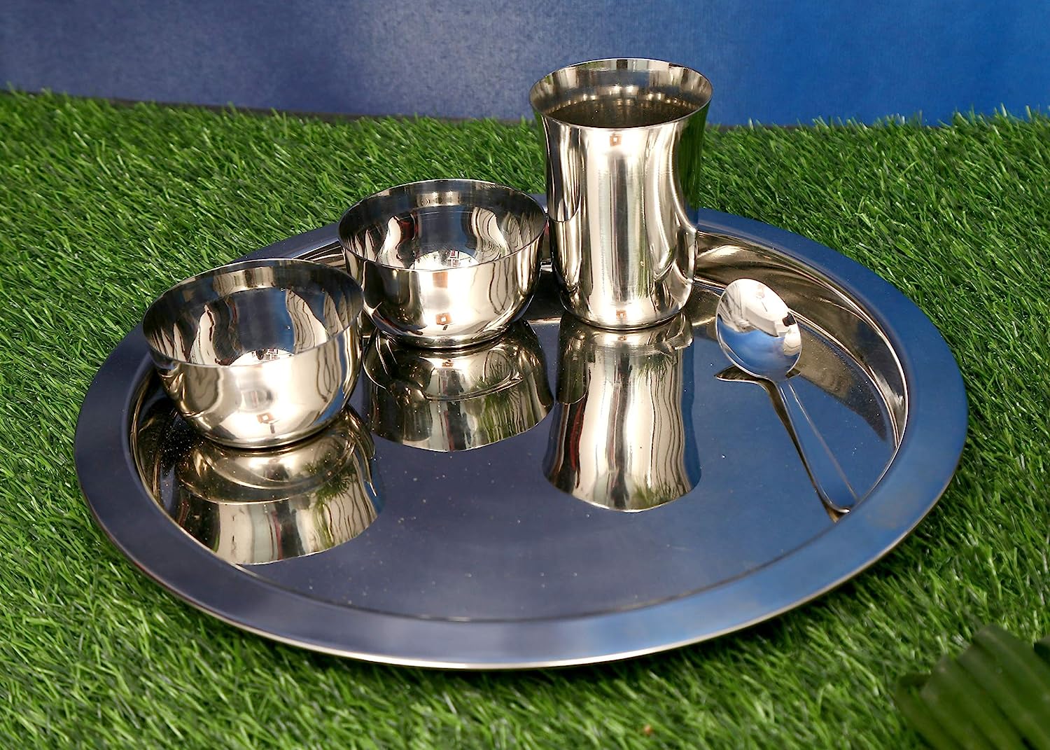• PACKAGE : 1 Big Thali, 2 Bowls/Katori, 1 Glass, 1 Spoon .