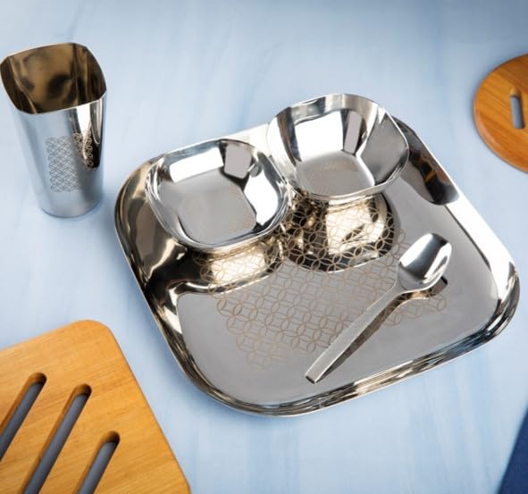 Ramson Stainless Steel Dinner Set 5pcs, Square | 1 Thali Plate, 1 Bowl, 1 Pudding, 1 Spoon, 1 Glass | Steel Lunch Thali Set - Ring Design