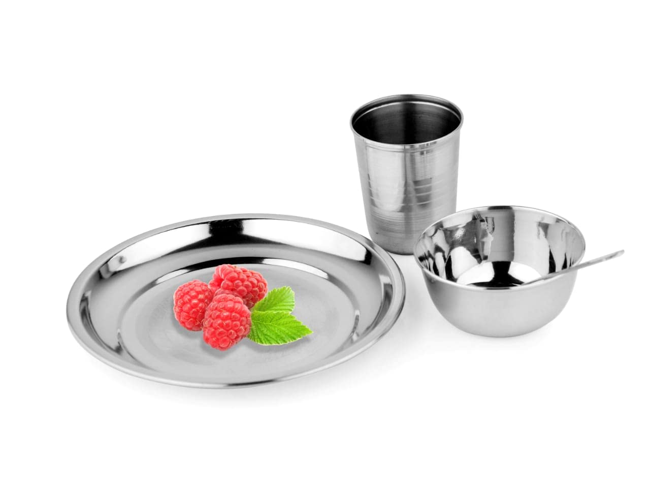 • FEATURES: Stainless Steel 4 Piece Thali Set (1 Thali, 1 Bowl, 1 Glass, 1 Spoon), Color: Silver, Material: Stainless Steel Heavy Grade, Volume: Glass – 300 ML Width/Diameter: Thali - 7 INCHES , First Bowl - 100 mm, Glass - 80 mm| NOTE: This is High Grade Heavy Thali Set