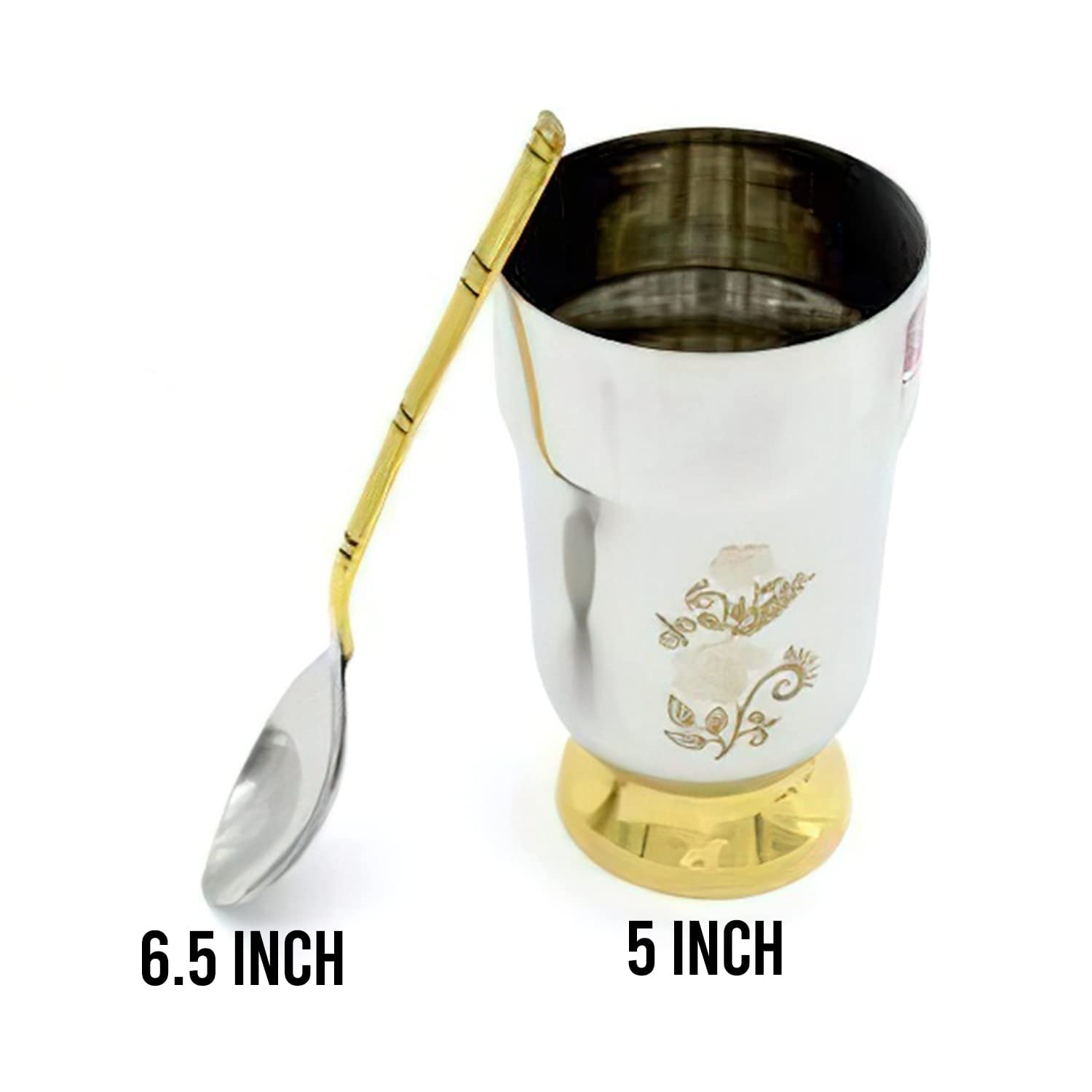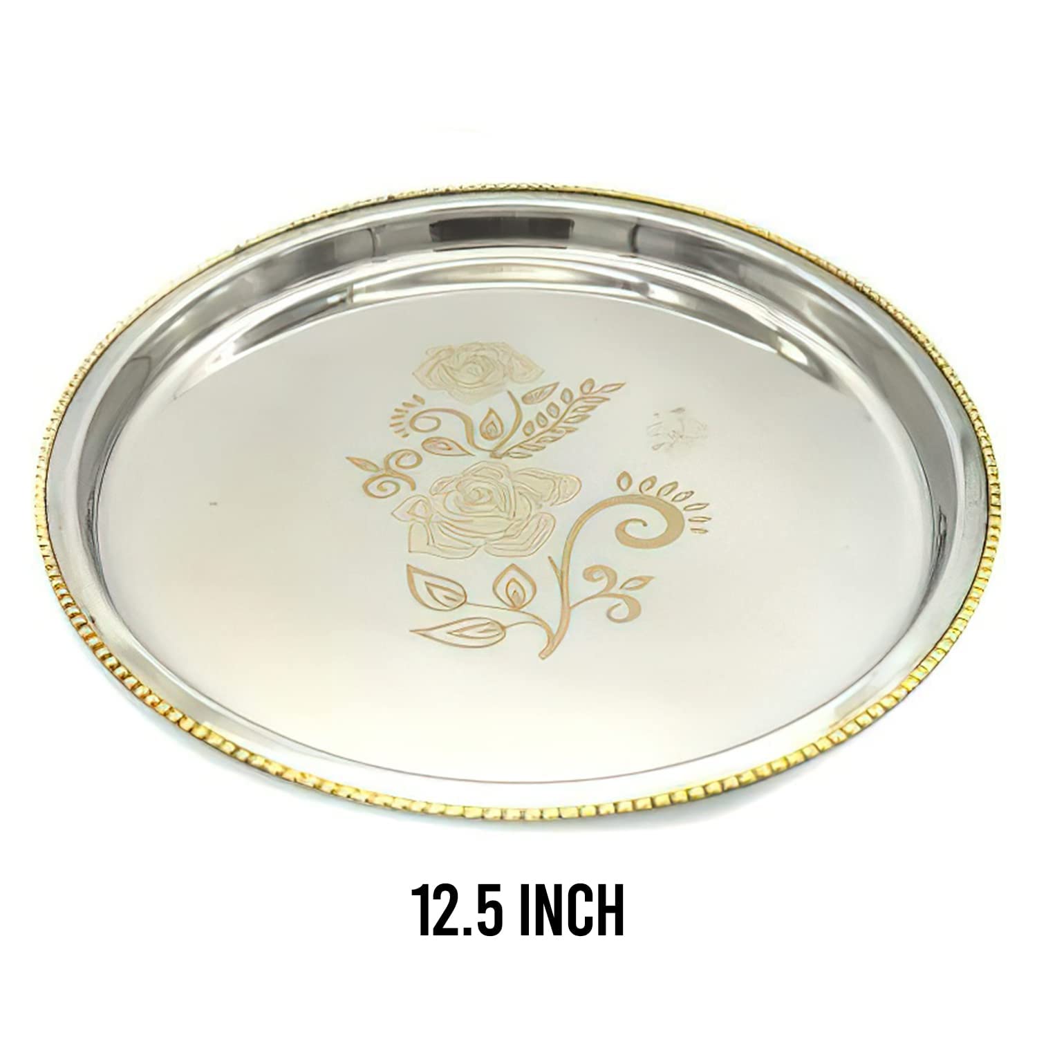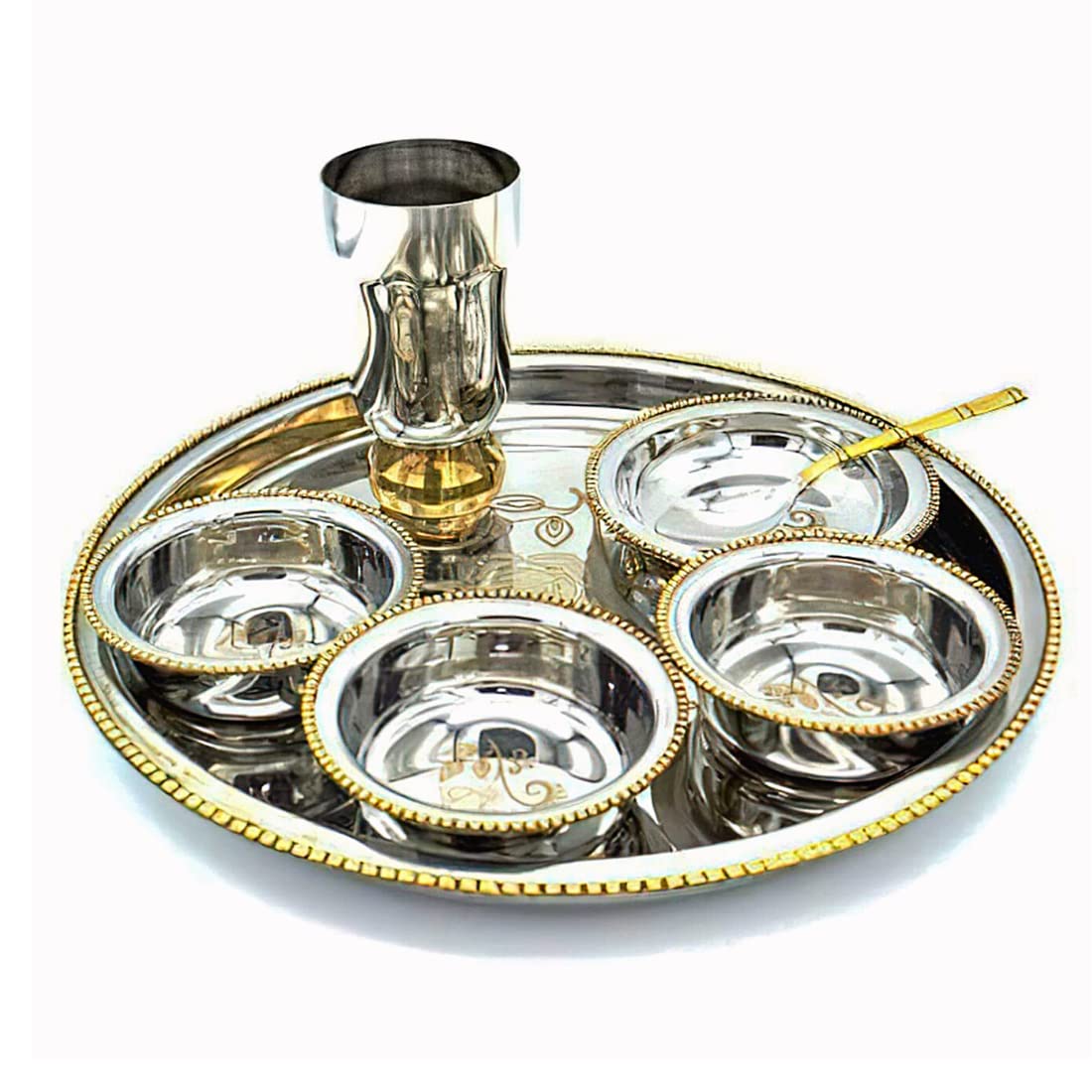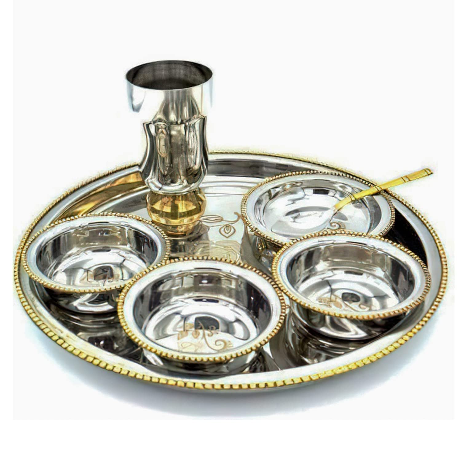 Premium Golden Unerasable Work Heavy Gauge Stainless Steel 7 Piece Thali Set|| 1 Thali, 1 Glass, 1 Spoon, 3 Bowls, 1 Dessert Bowl