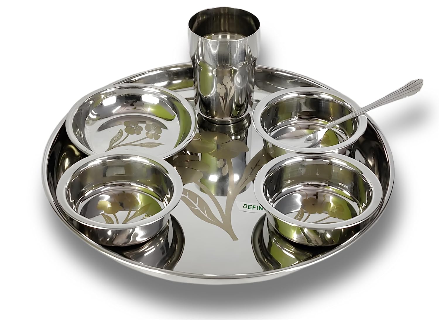 Thali Set Full Steel with Laser Design(Stainless Steel); 7 pcs: 1 Thali, 3 Bowls, 1 Pudding Bowl, 1 Glass, 1 Spoon
