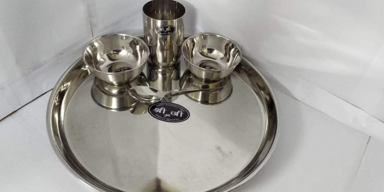 • CONTENT Stainless Steel Thali Set 5 Pieces Consist Of 2 Bowls 1 Thali 1 Spoon & 1 Glass