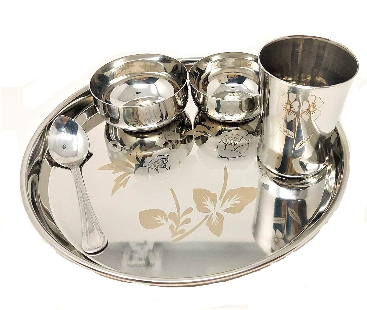 Stainless Steel Dinner Set Flower Print 1 Thali ,2 Bowl,1 Glass, 1 Spoon Dinner Set (Thali Diameter 280mm-5 Pieces)