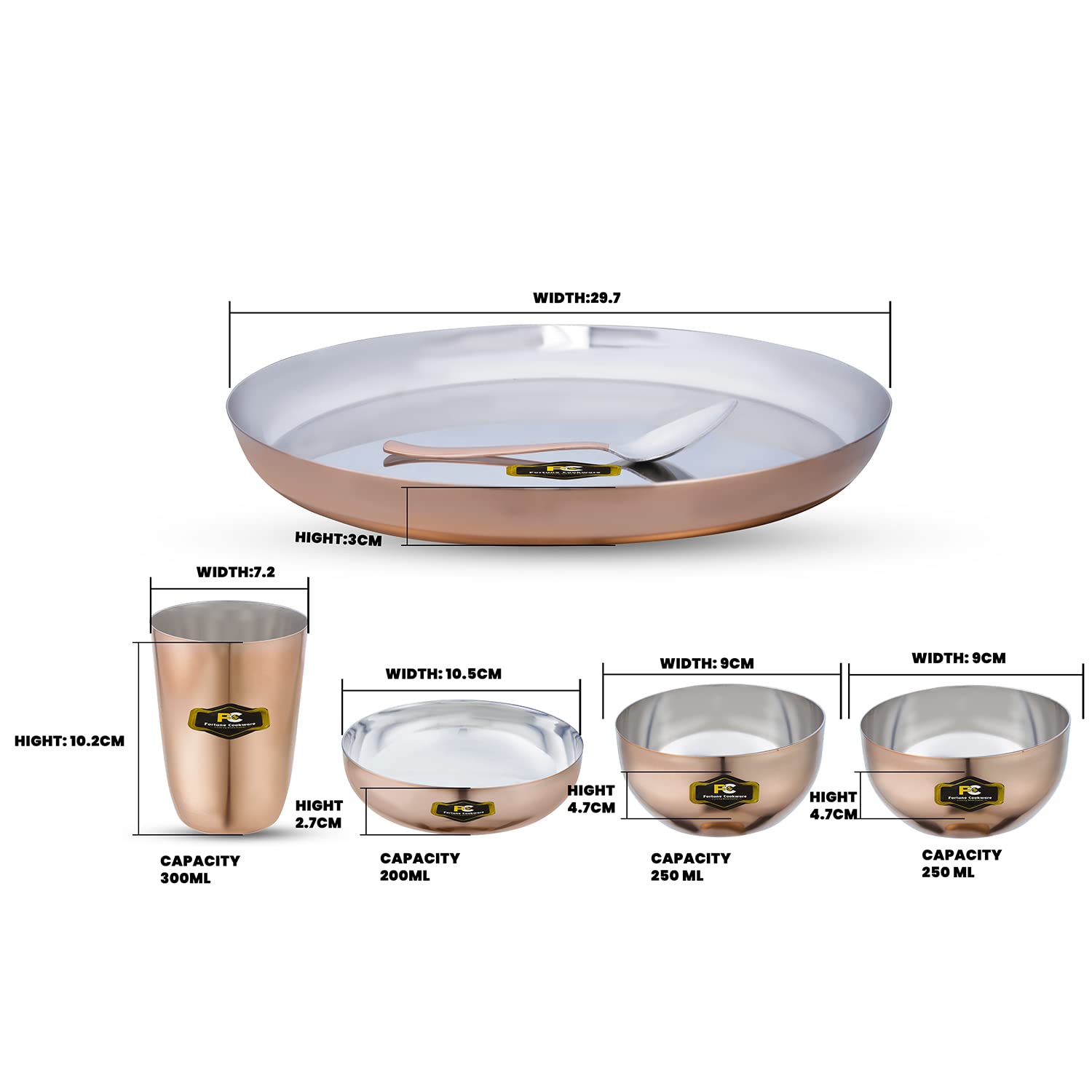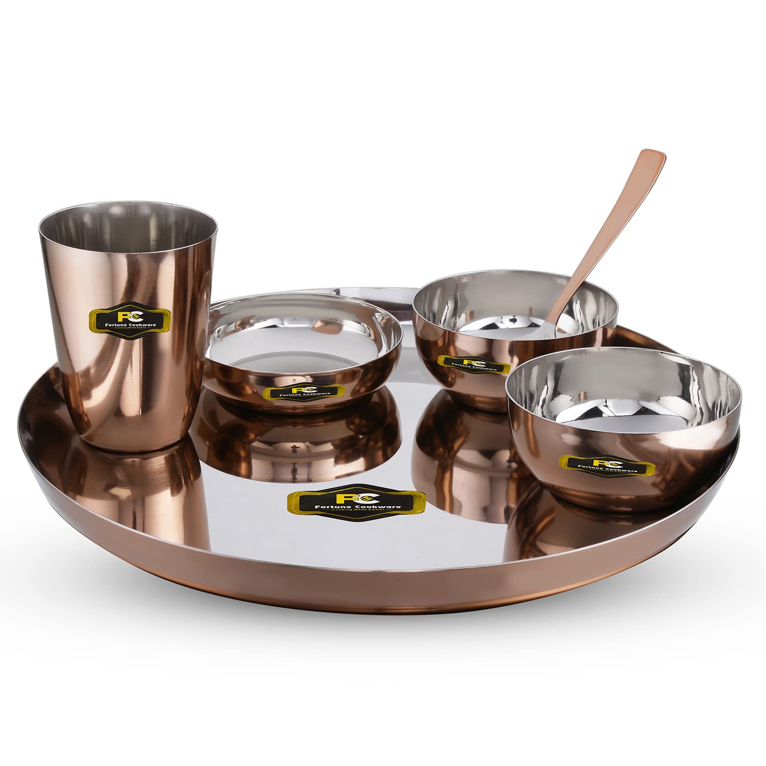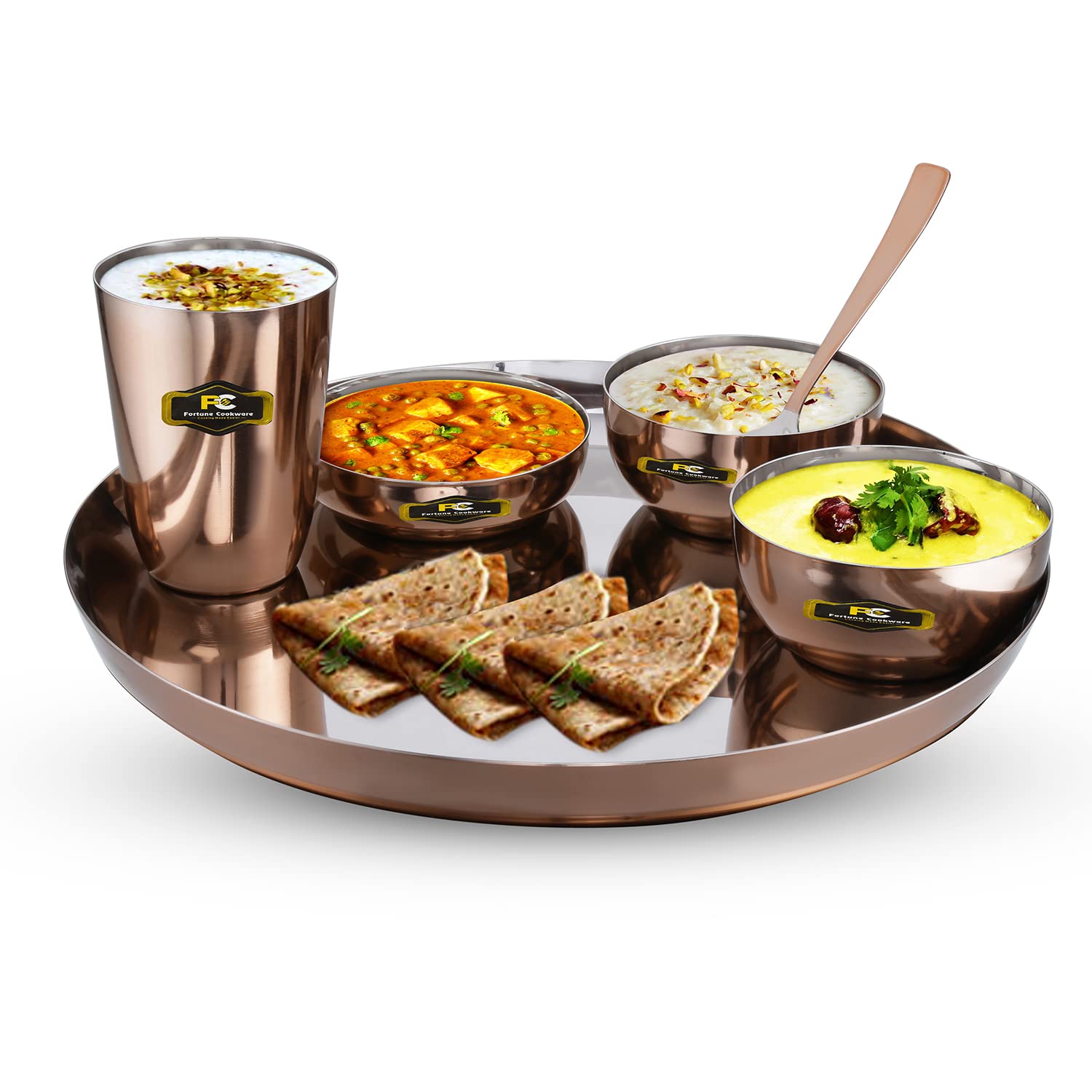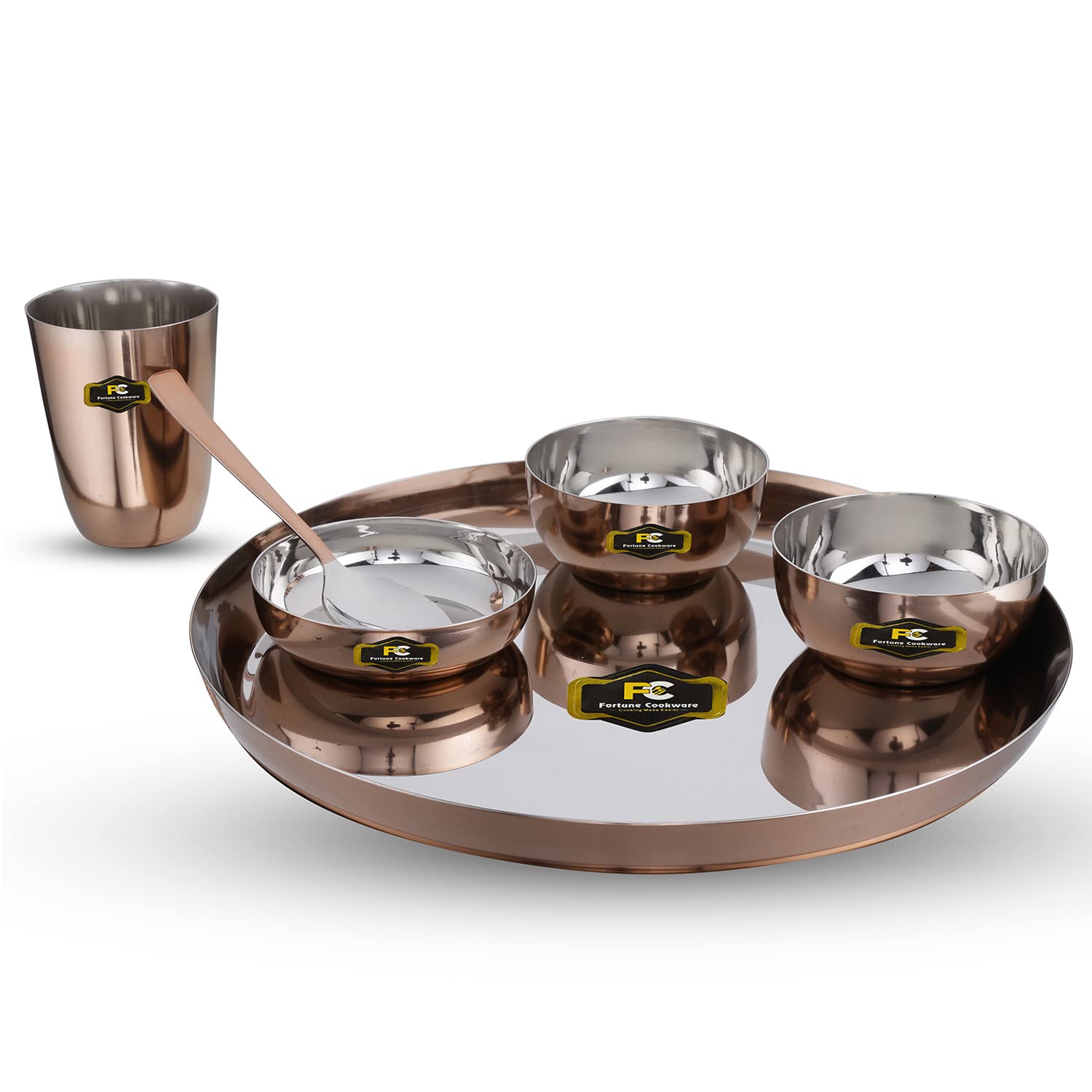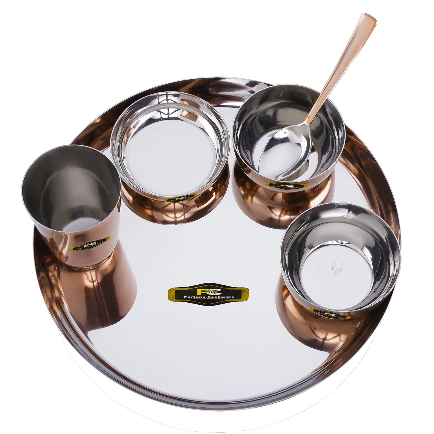 • Fortune Cookware Steel Copper Design 6 Pieces Dinner Set/Thali Set Of 1 Thali, 1 Glass, 1 Spoon, 1 Small Plate & 2 Bowls, Dinnerware, Tableware Or Crockery