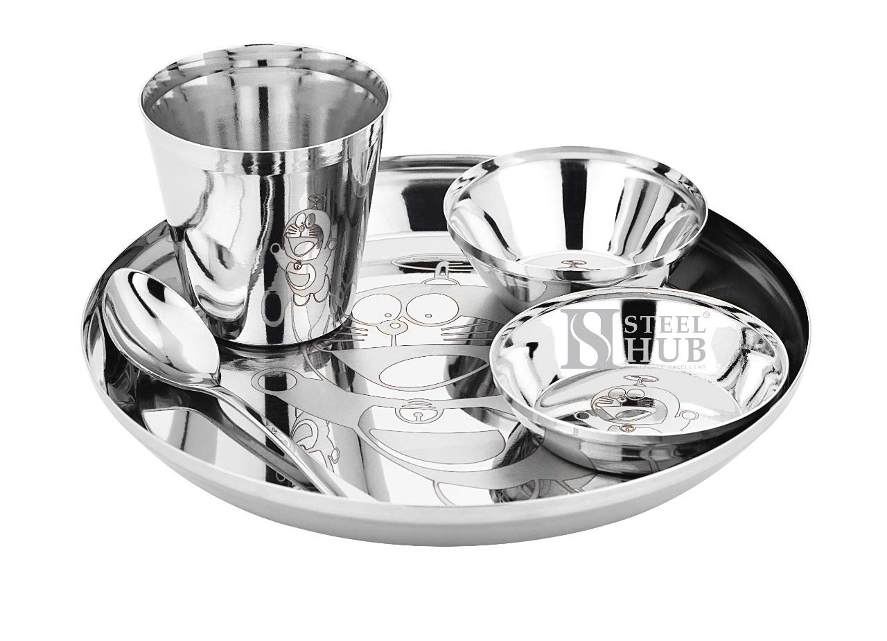 Stainless Steel Dinner Set - 6 Piece Dinner Set Bowl, Sweet Dish (halwa Plate), Glass, Spoon, Fork and Plate (Kids Set Laser Printed 1)