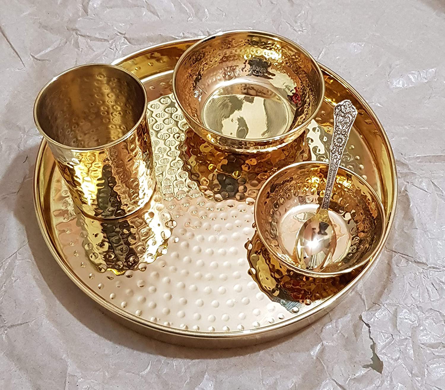 • Material: Pure Hammered Brass, Included Components: 1 Dinner Thali, 2 Dinner Bowls, 1 Glass, 1 Spoon