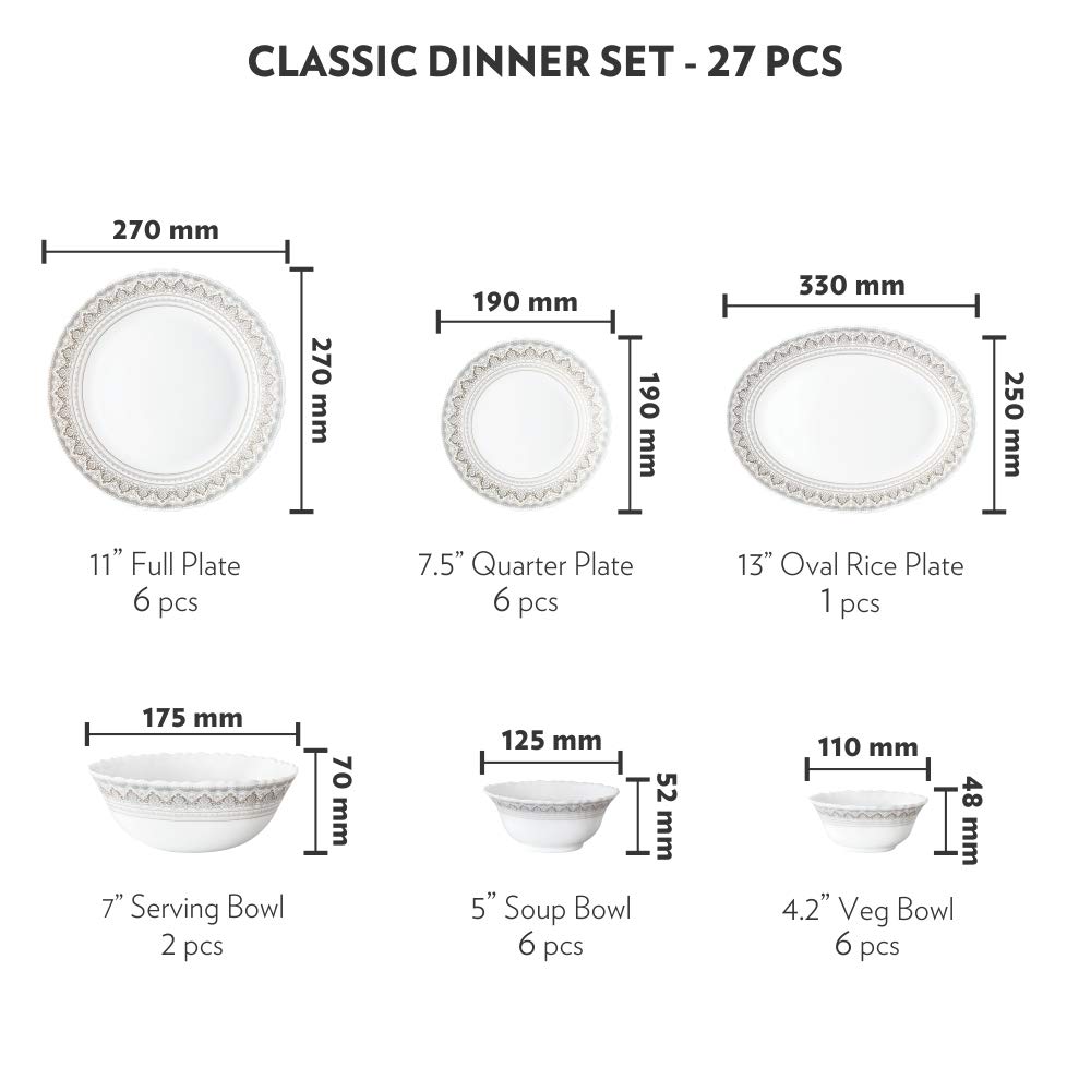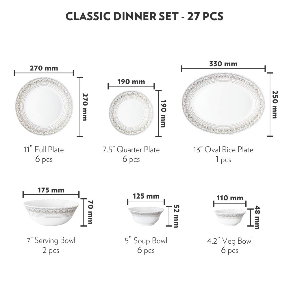 • Package Contents: 6-Piece Full Plate, 6-Piece Quater Plate, 6-Piece Veg Bowl, 6-Piece Soup Bowl, 2-Piece Serving Bowl, 1 Oval Rice Plate