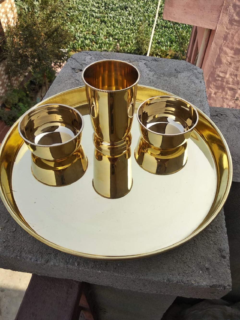 • Set of Thali : Thali 12x12x1 1/2 inch weight 500 gm, Glass Height 4.5 and width 3 inch weight 250 gm, Bowl (2 nos) Height 2 and width 3 1/2 inch weight of two bowl 300 gm,