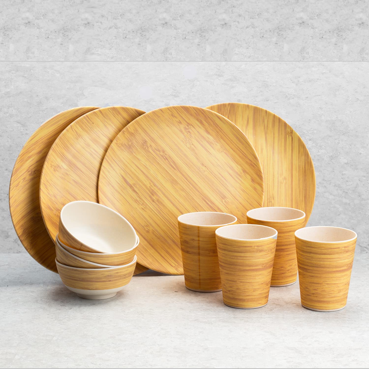 Bamboo Fibre Dinner Set - a Set of 12 Pieces | 10-inch Plates, 4 inch Bowl & 380ml Glass Featuring a Wooden Design | Made of Natural Bamboo and Corn Powder, eco-Friendly