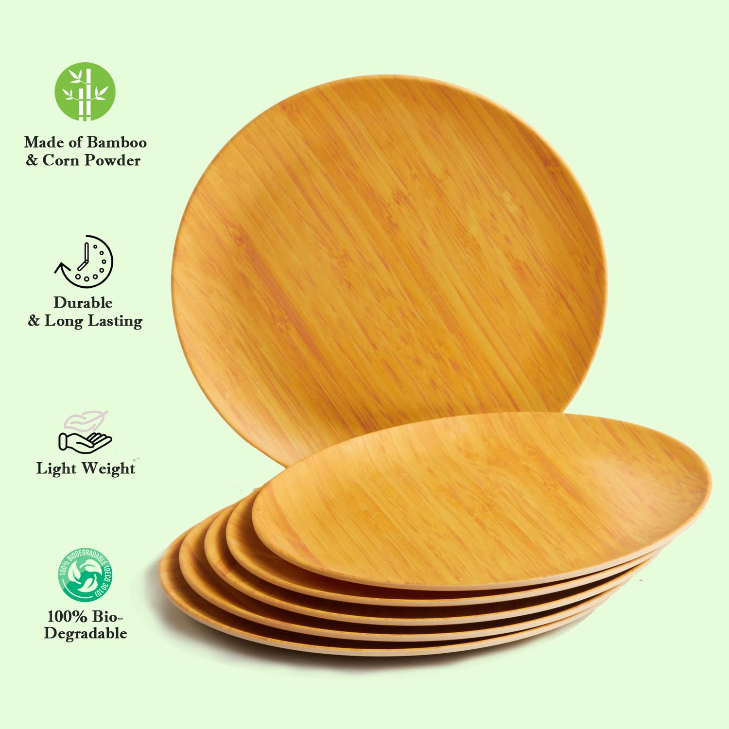 • 100% Bio-Degradable :Bambo fibre dinner set is completely bio-degradable, which means you don’t need to worry about waste and impact on the environment. Biodegradable refers to the ability of materials to break down and return to nature. In order for packaging products or materials to qualify as biodegradable, they must completely break down and decompose into natural elements within a short time after disposal.