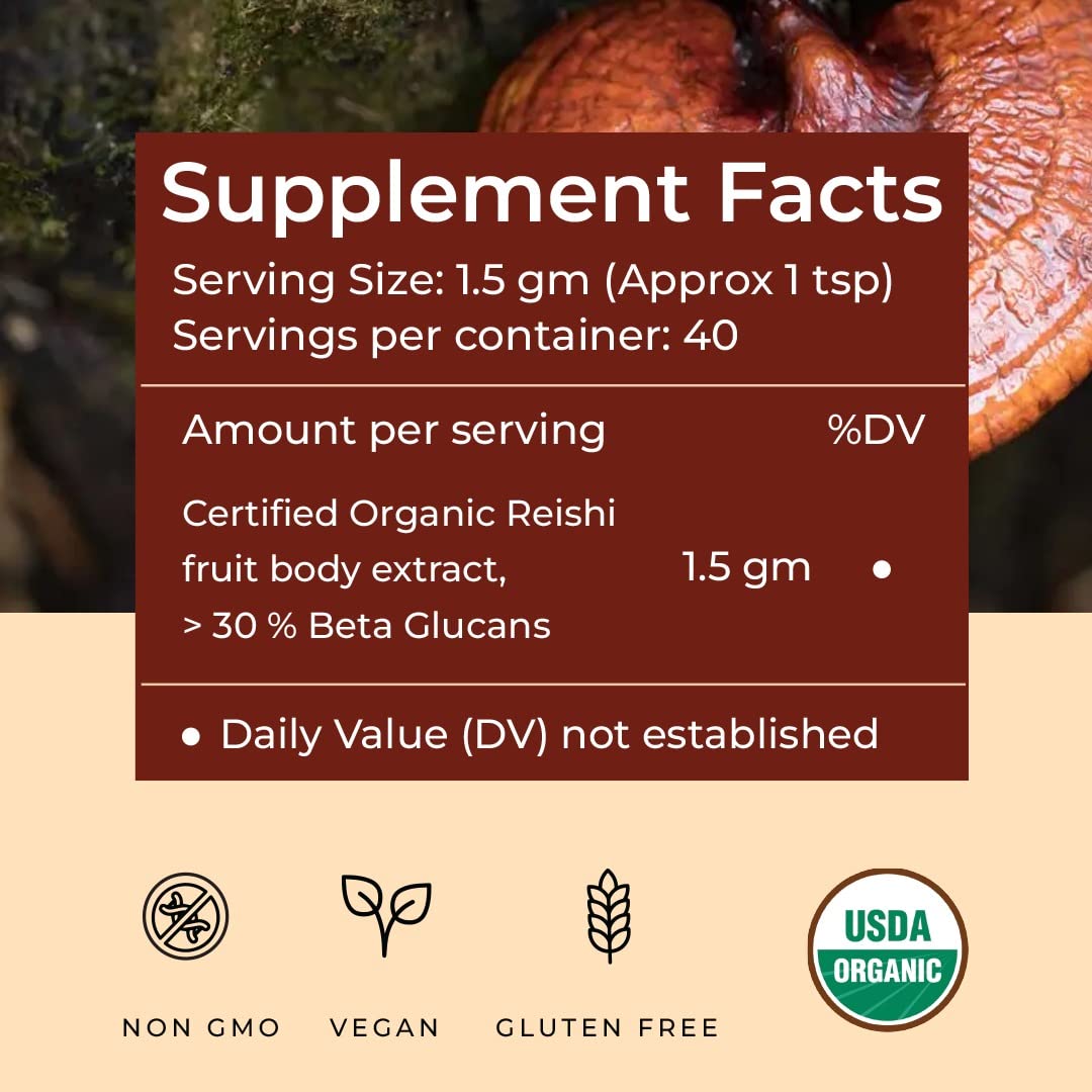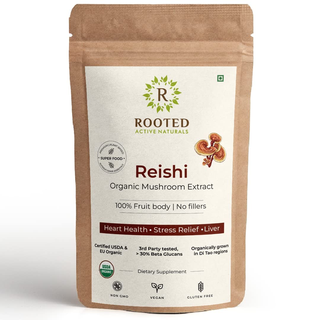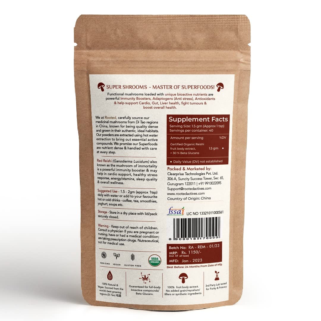 Rooted Reishi mushroom Extract Powder (60 gm) | Heart health, Stress Relief, Liver. USDA Organic, 30?ta Glucans, Certified organic