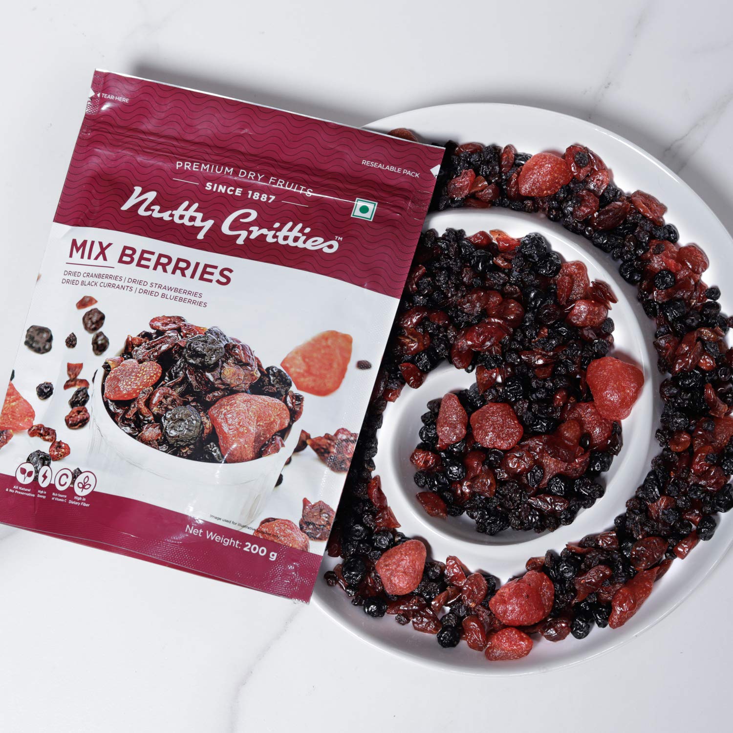 - INGREDIENTS: Dried Cranberries (30%), Dried Strawberries (25%), Dried Black Currant (25%), Dried Blueberries (20%). TASTE- Sweet, delicious and tangy, Net Weight: - 200grams ,