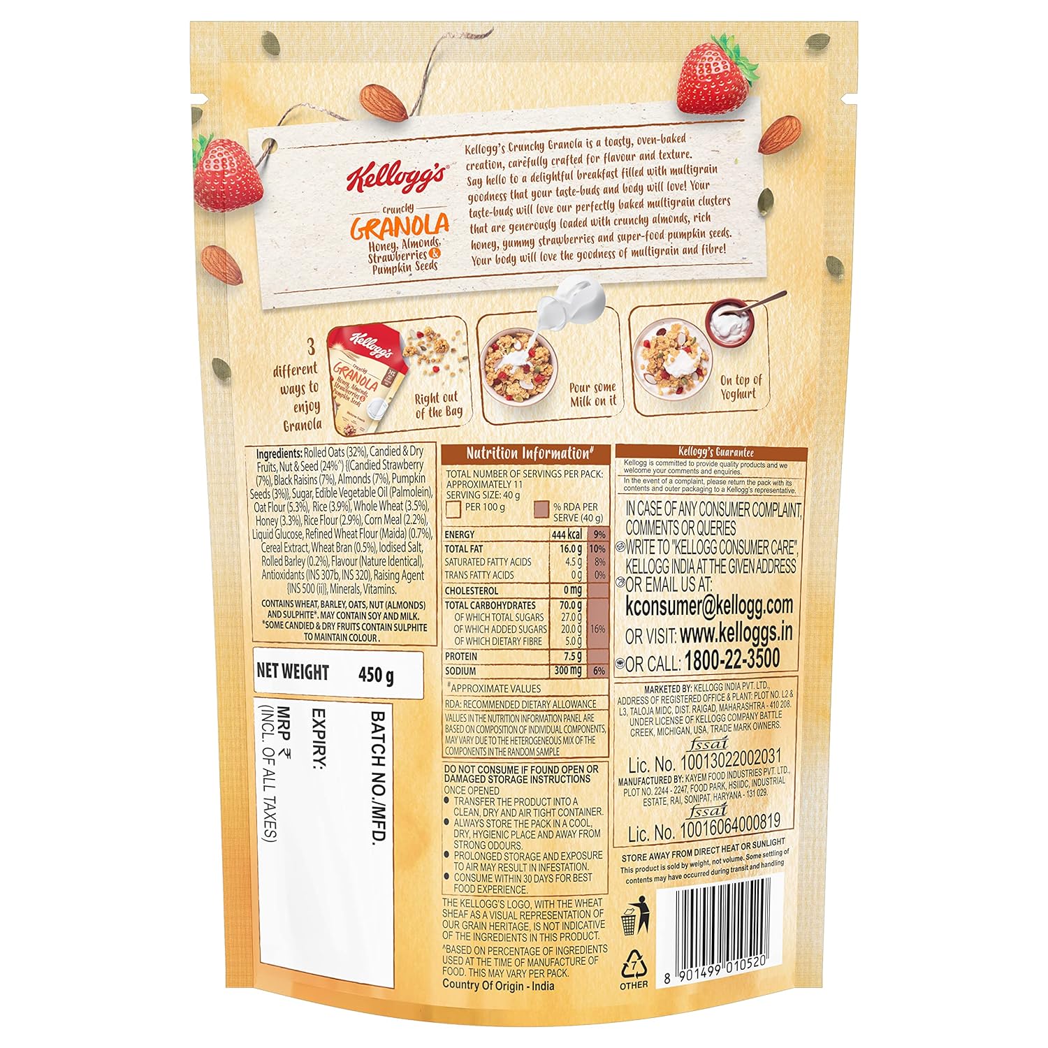 Kellogg's crunchy granola is a toasty, oven-baked creation, carefully crafted for flavour and texture. Say hello to a delightful breakfast filled with multigrain goodness that your taste-buds and body will love. Your taste-buds will love our perfectly baked multigrain clusters that are generously loaded with crunchy almonds, rich honey, yummy strawberries and super-food pumpkin seeds. Your body will love the goodness of multigrain and fibre