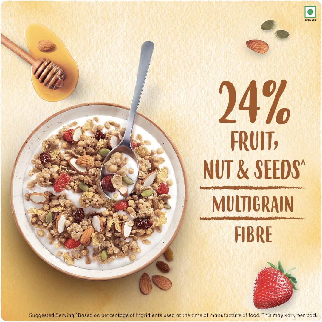Kellogg's crunchy granola is a toasty, oven-baked creation, carefully crafted for flavour and texture. Say hello to a delightful breakfast filled with multigrain goodness that your taste-buds and body will love. Your taste-buds will love our perfectly baked multigrain clusters that are generously loaded with crunchy almonds, rich honey, yummy strawberries and super-food pumpkin seeds. Your body will love the goodness of multigrain and fibre.