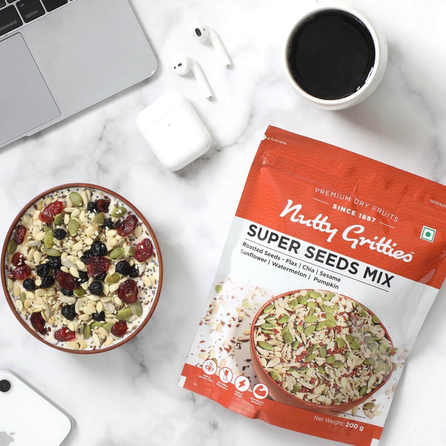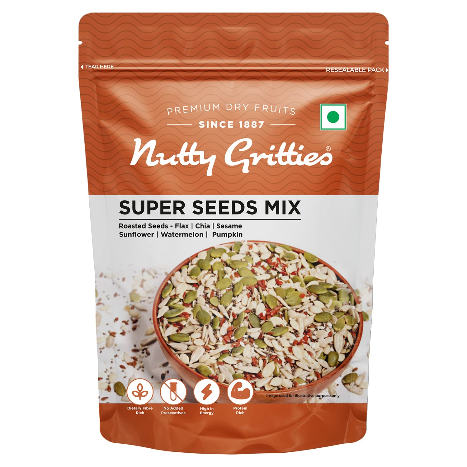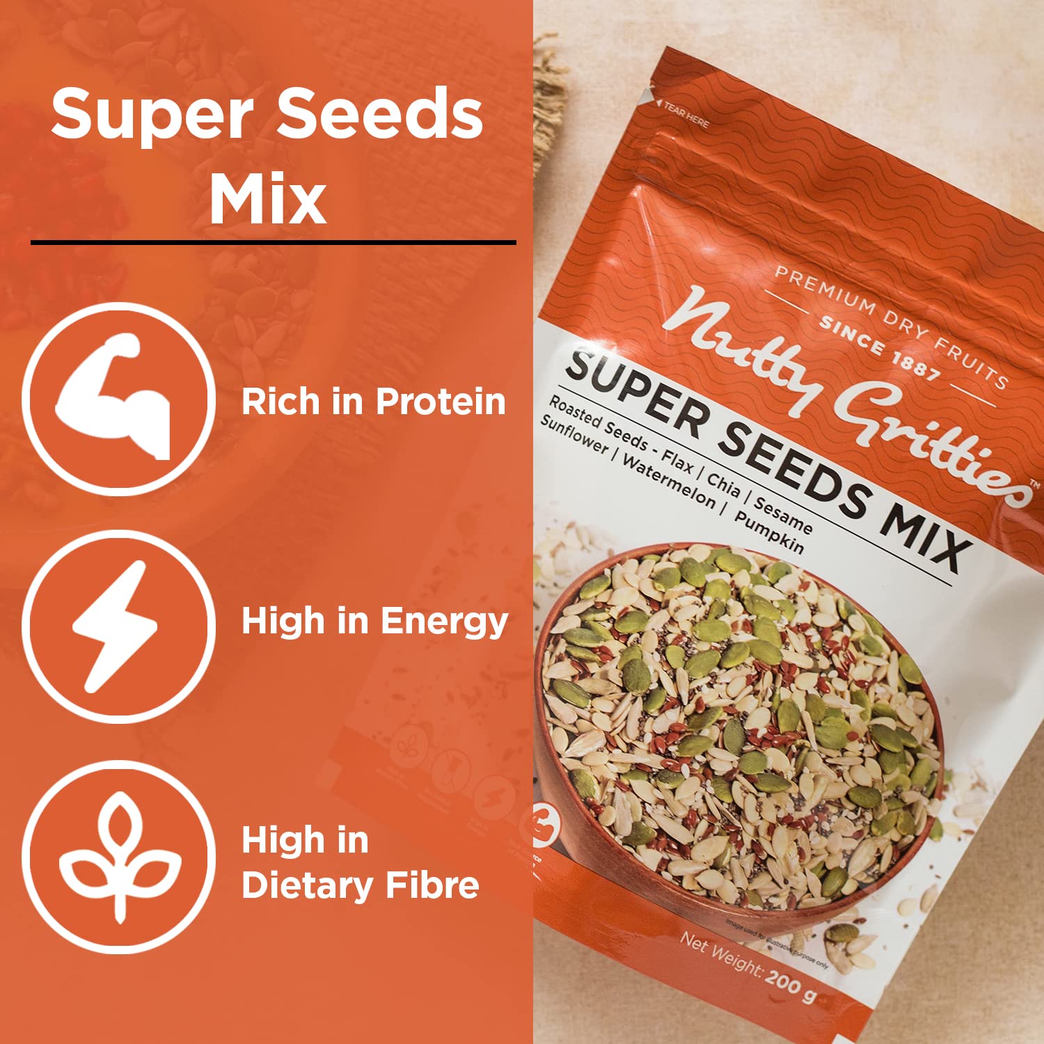 • Rich source of protein (27g in 100g Super Seeds Mix)- Makes you feel fuller and satiated.
