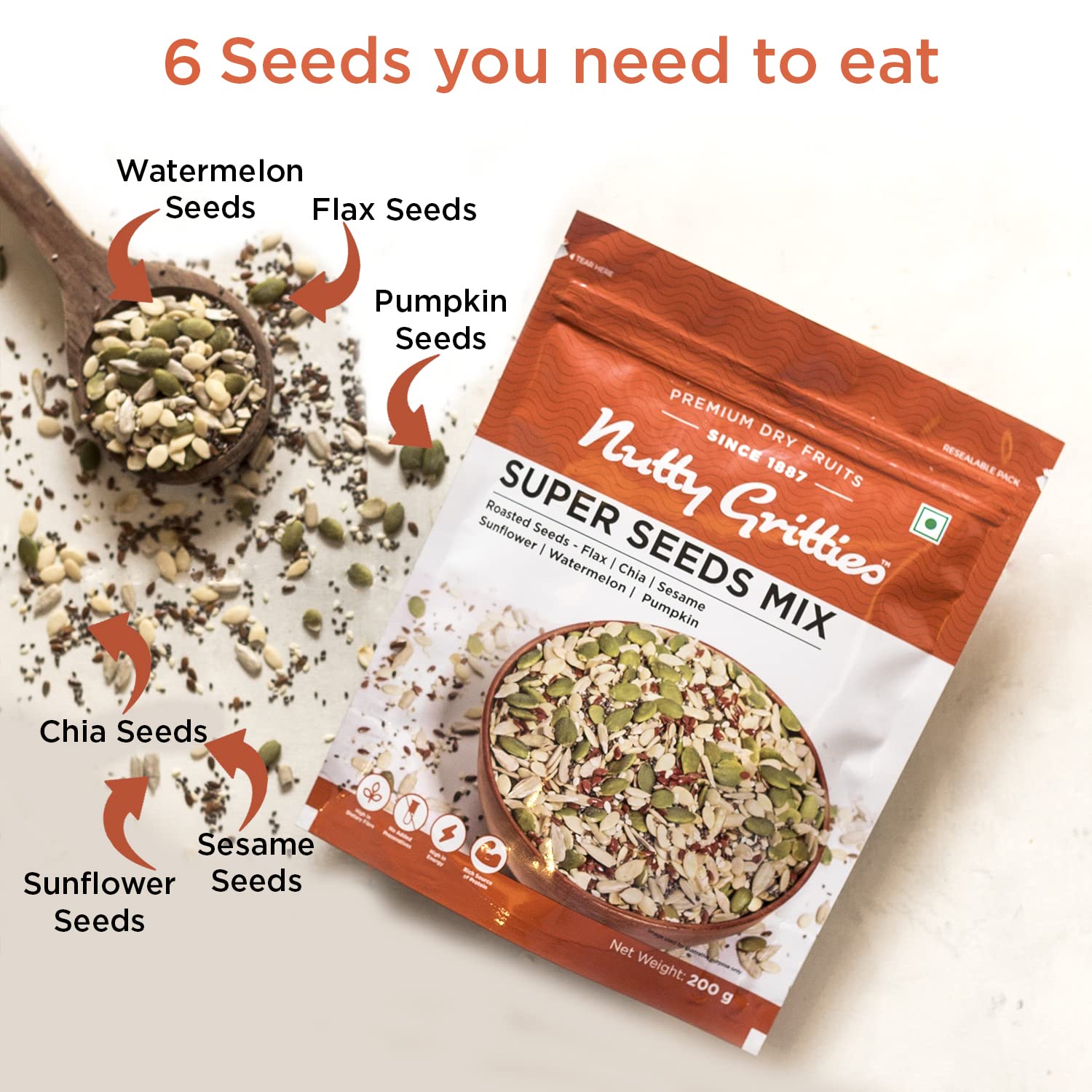 Gritties Premium Super Seed Trail Mix 200g - 6 Super Seed in 1 Mix |Roasted Unsalted Mix Seeds - Flax, Chia, Sesame, Sunflower, Watermelon, Pumpkin Seeds, Mixed Seeds for Eating