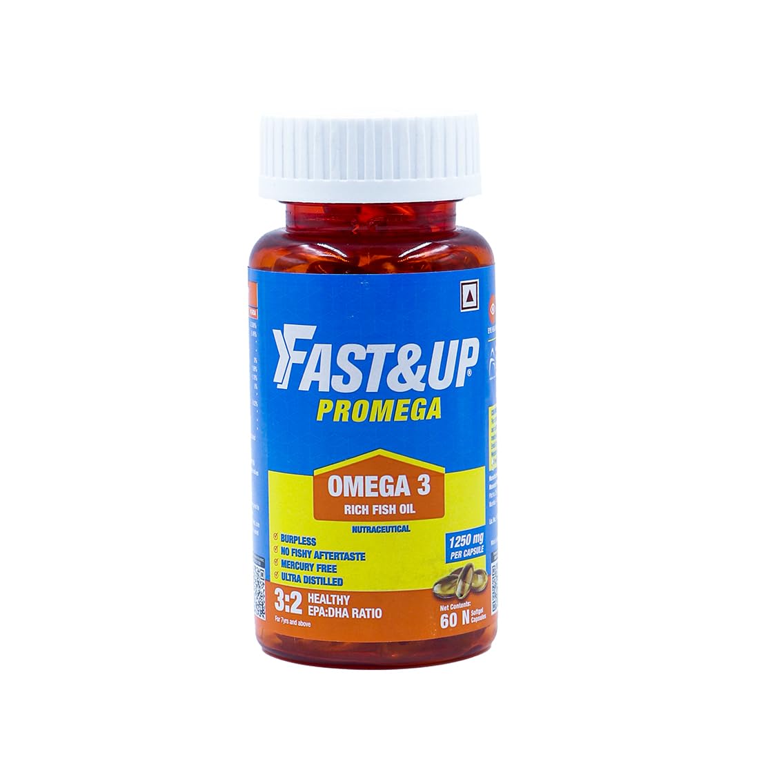 - Fast&Up Promega provides pure & ultra-distilled fish oil rich in omega-3 fatty acids in soft gel capsules formulated with high quality 1250mg Omega-3 rich fish oil with double strength 375 mg EPA and 250 mg DHA in 3:2 ideal ratio