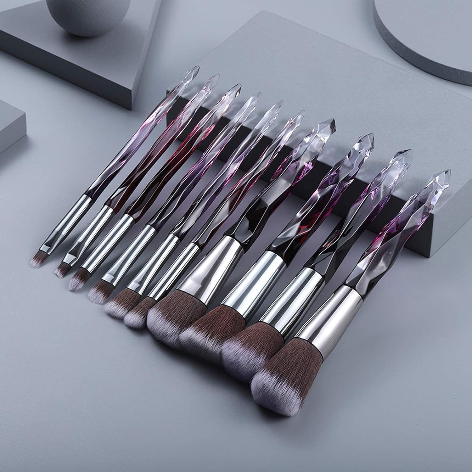 - ???? Popular Crystal Style Makeup Brush Set - This crystal style makeup brush set will be the best gift choice for you. The irregular surface of its transparent handle will emit fascinating purple-colored light in the light or sunlight.