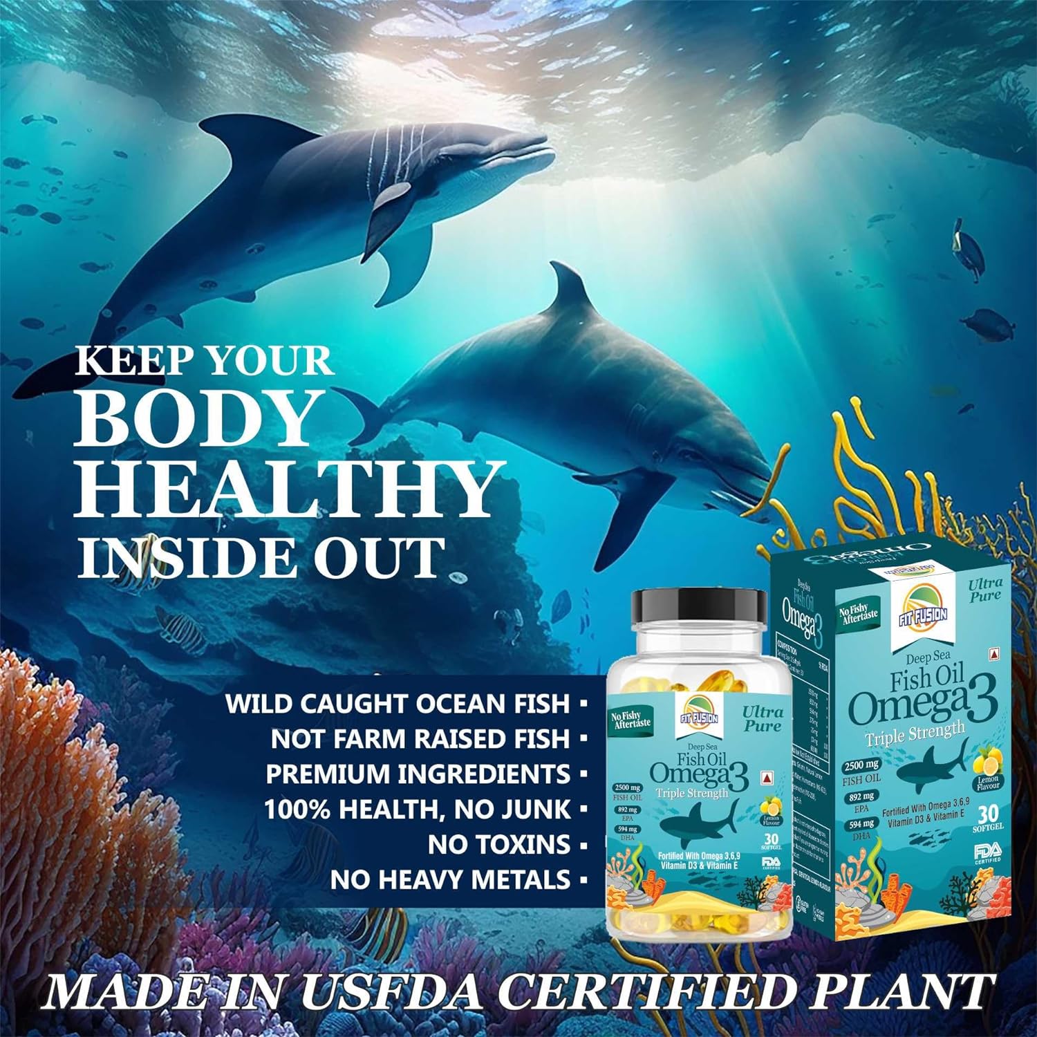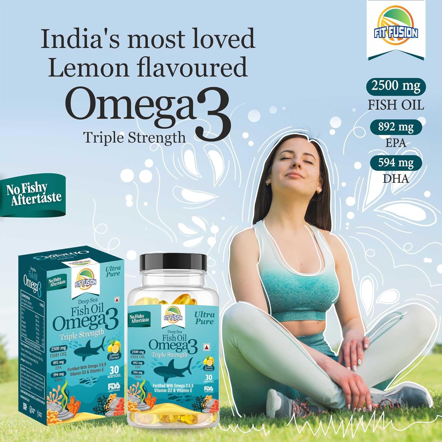 FIT FUSION Deep sea Omega 3 fish oil capsules supplement, 2500 mg, LEMON FLAVOUR, TRIPLE STRENGTH, EPA 892 mg, DHA 594 mg, Omega 6,9, Vit.D3, Vit. E, No fishy aftertaste, softgels for brain, heart, eye, skin & joints (30)