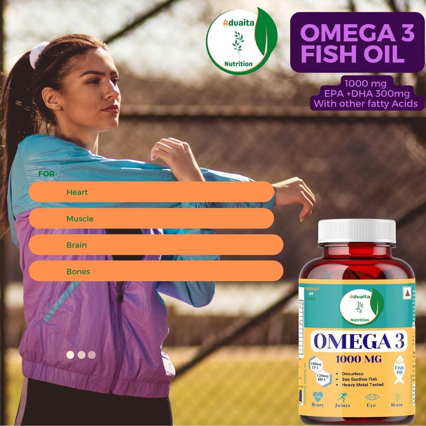 Advaita Nutrition Omega 3 Fish oil 1000mg with 180 mg EPA and 120 mg DHA for eye,heart,brain,bones & joints health (30 Softgel)