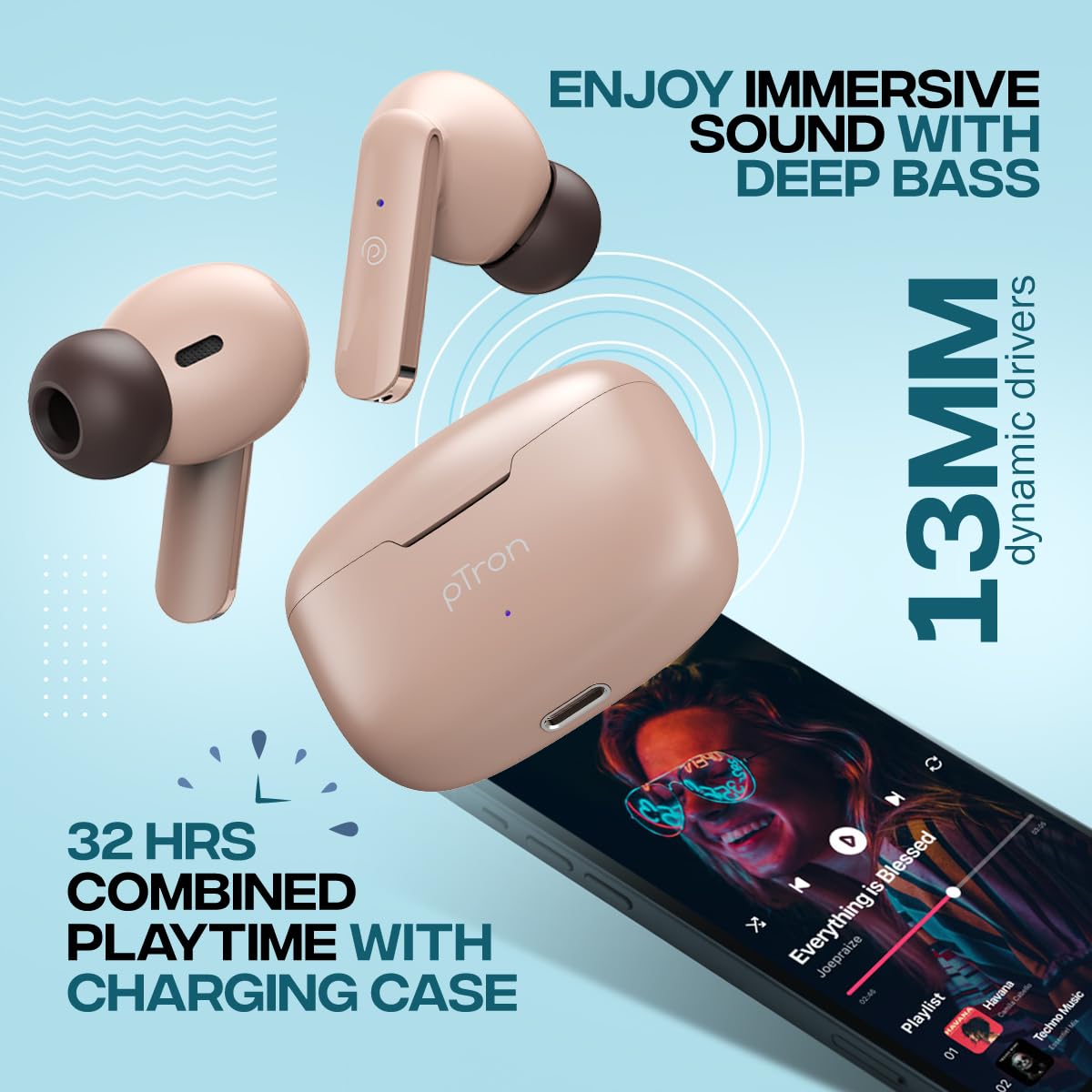 • TWS earbuds with Large 13mm Dynamic Driver to produce Immersive Stereo Sound & Deep Bass | Smart Touch controls & 32 Hours of non-stop Combined Playtime with the charging case