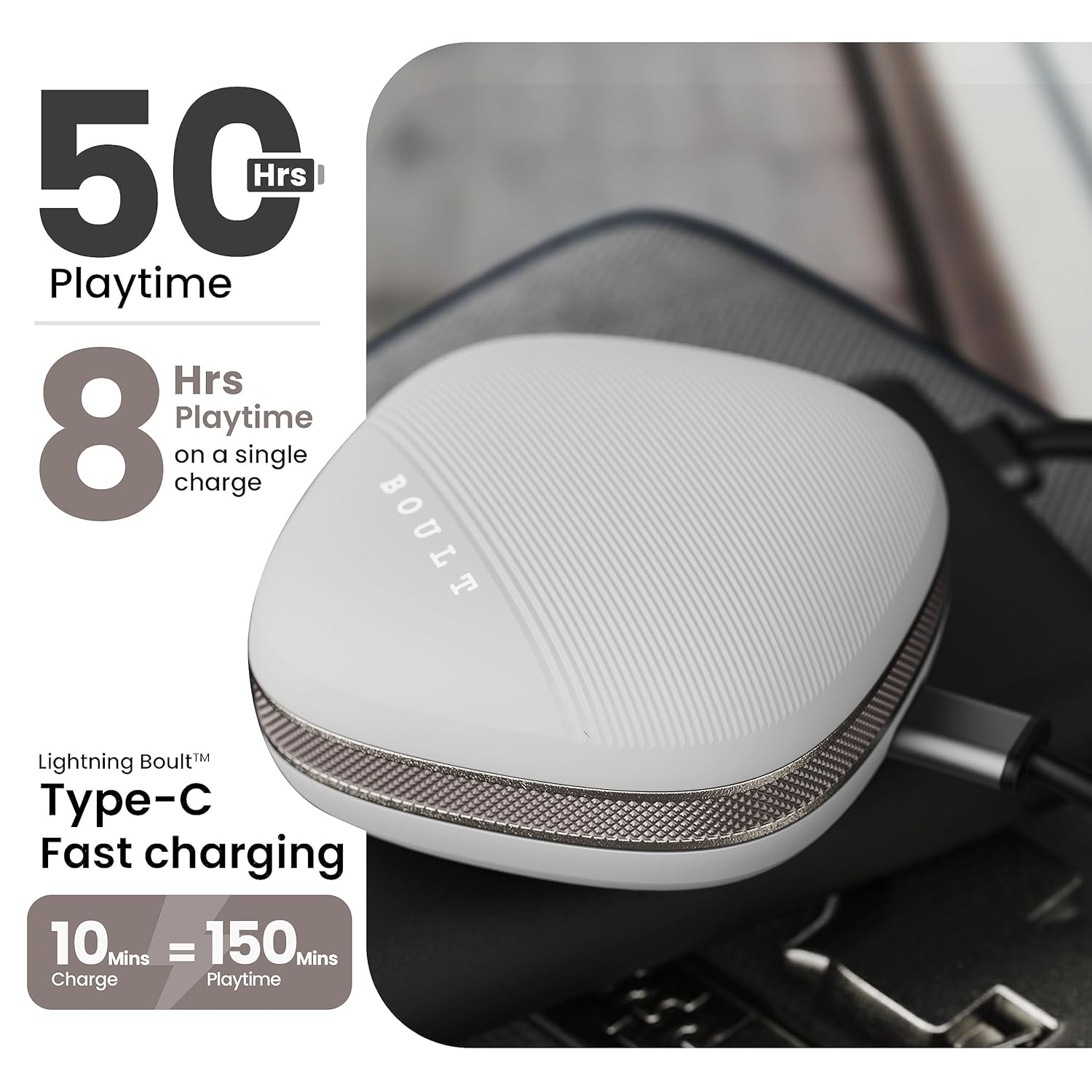 - [Lightning Boult Type-C Fast Charging]: Experience the future of hassle-free charging with the Boult W50 Ear buds. Featuring Type-C fast charging, these earbuds empower you to spend less time waiting and more time enjoying your music. With a quick charge, you'll be back in action in no time.
