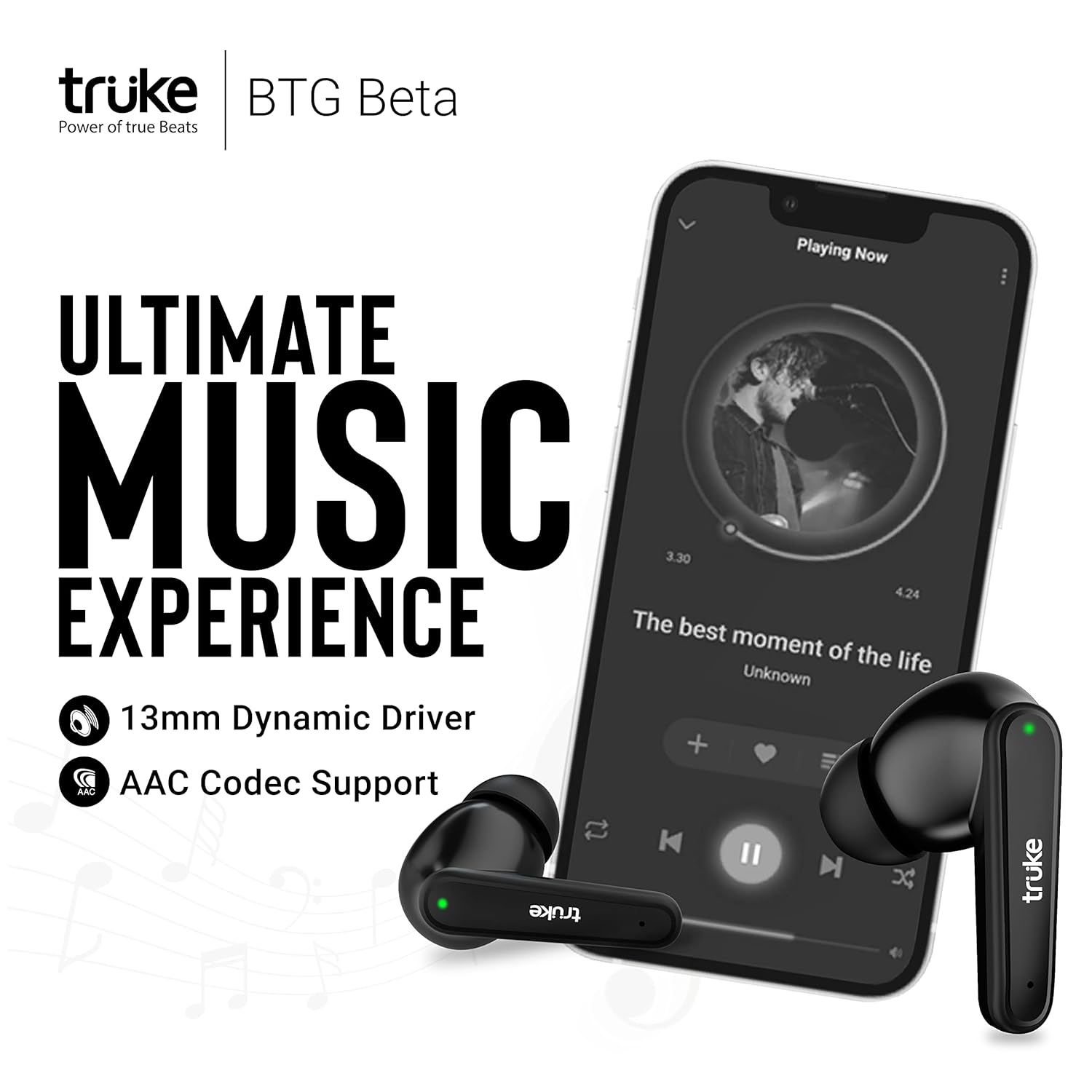 - [Ultimate Music Experience] : Enjoy Cinematic Sound on Music mode with Powerful Deep Bass powered by Big 13mm Dynamic Driver Speakers on truke BTG Beta earbuds. These Buds support both SBC & AAC Codec.