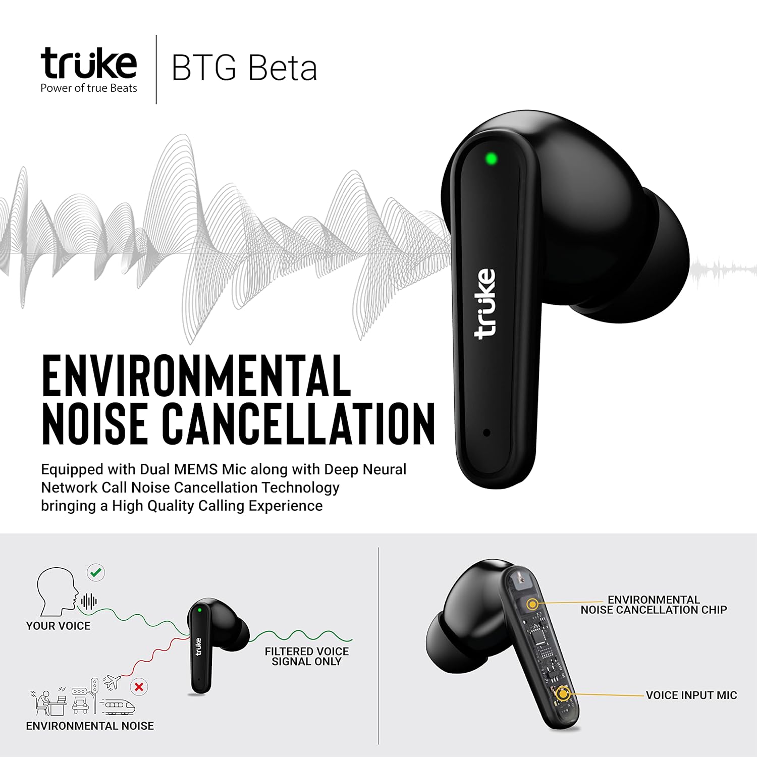 - [Clear Calling] : Environmental Noise Cancellation on BTG Beta Earbuds cancels unwanted noise to give a crisp and clear calling experience.