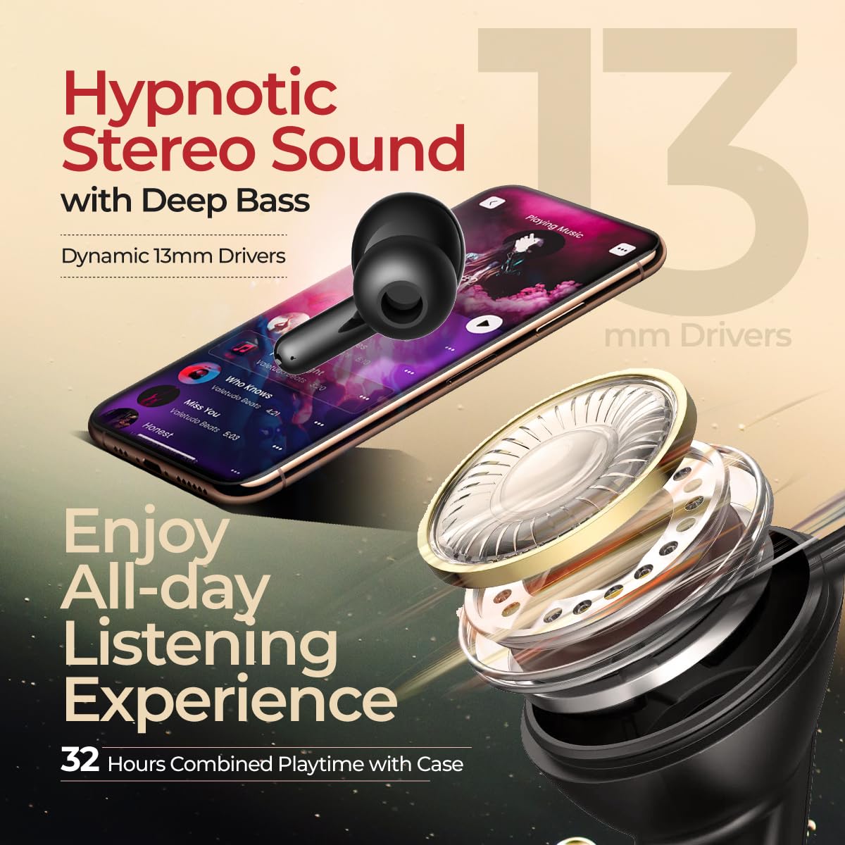 - Large 13mm dynamic drivers ensure Immersive stereo sound with deep bass | TruTalk AI-ENC (environmental noise cancellation) technology ensures your voice is heard loud & clear on the calls.