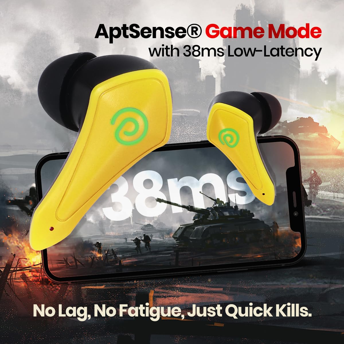 • TWS Earbuds with AptSense 38ms Low Latency Mobile Gaming | Stereo Sound Quality with Deep Bass | 45 Hrs Total Playtime with the Charging Case | Ergo-fit Bluetooth Earphones with Touch Controls