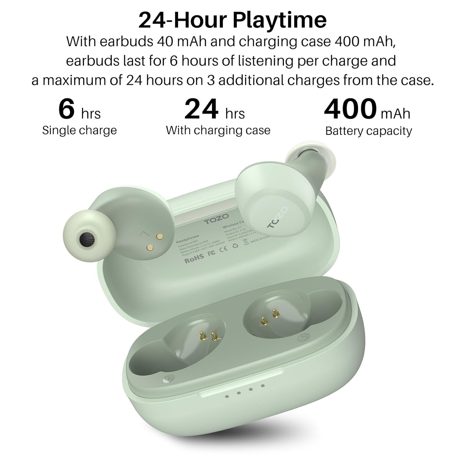 - [Long Battery Life] With headphone 40mAh capacity and charging bin 400mAh capacity. The earbuds lasts 6 hours for normal use (60% volume), and the charging bin lasts 24 hours for 3 charges, which gives you excellent experience of long endurance.