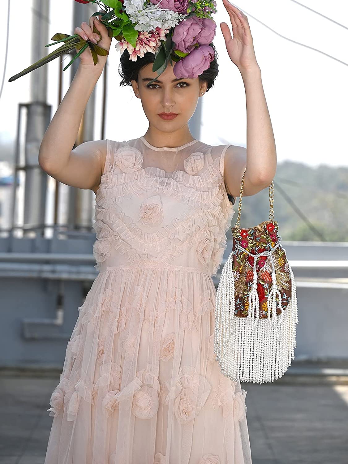 Odette Women's Brown Embroidered Structural Tassel Potli