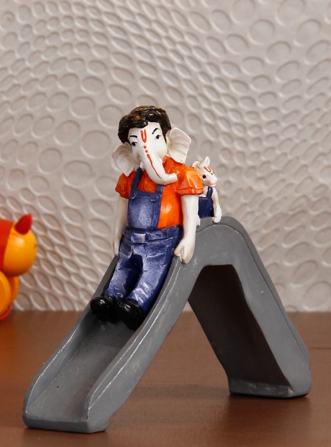 , we have a huge collection of interesting figurines, including ones that portray Ganesha in a different light. This Ganesha is ready to come zipping down the slide with Mooshak right behind him– what is interesting is that Ganesha is dressed in overalls, as opposed to any traditional wear. Pick this for your own home or as a gift for friends and family members. You can find many more god idols and figurines in different avatars on our online portal in various colors that suit your home or office interior.