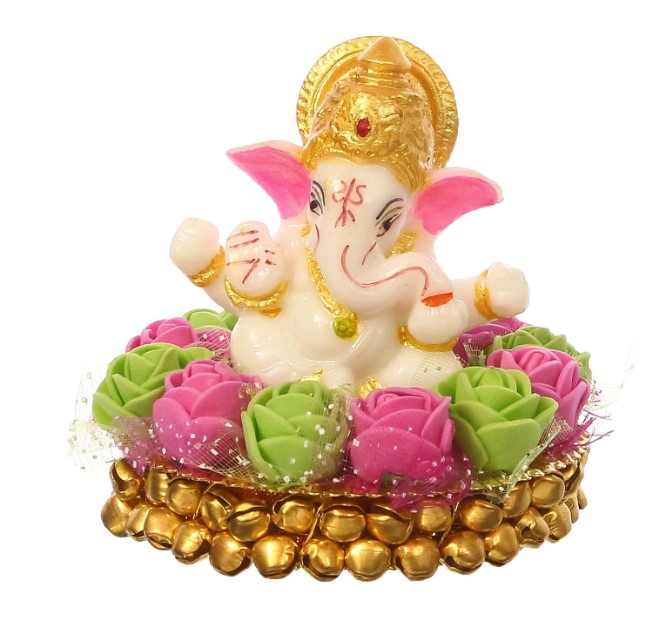 Package Content - One Lord Ganesha Idol on Decorative Handcrafted Plate with Pink and Green Flowers