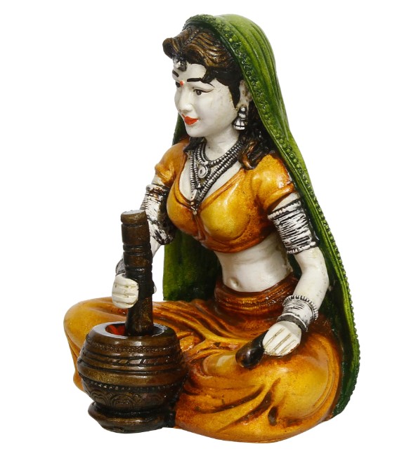 Product Description - With this stunning display of Rajasthani lady grinding chilli, you may add a creative and regal touch to your home decor. This statue is a handicrafted decorative showpiece that exudes style and elegance. This display demonstrates how a straightforward artwork may develop into a marvel of craftsmanship. The skilled artisans of , who are on a mission to bring Indian art and culture into every home in India, meticulously handicrafted this human figurine. Giving this to your friends and family will make them think of you every time they look at the finely detailed human miniature. On our online store, you can find numerous idols and figurines in various shapes and colors to match your home or office interior.