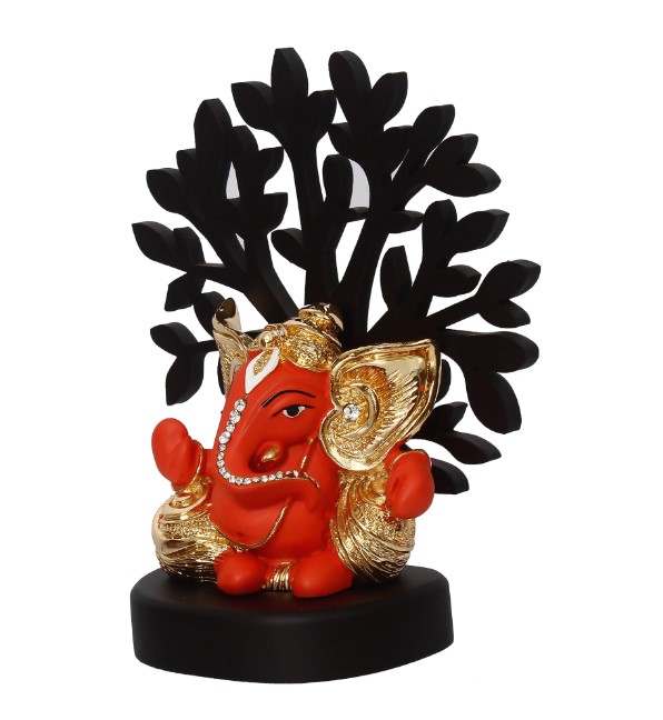 Package Content - One Gold Plated Orange Kaan Ganesha Decorative Showpiece with Wooden Tree for Home/Temple/Office/Car Dashboard