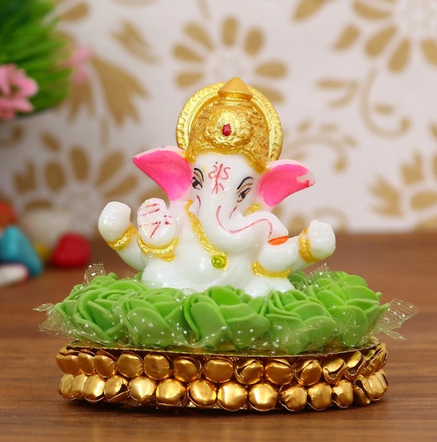 Package Content - One Lord Ganesha Idol on Decorative Handcrafted Plate with Green Flowers