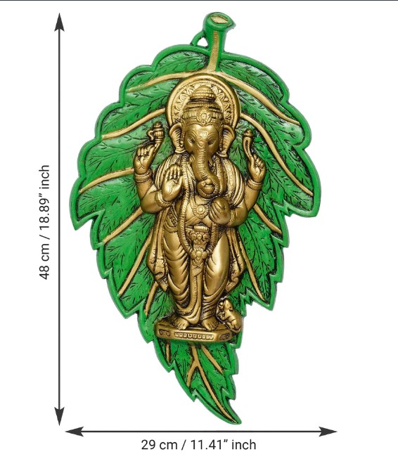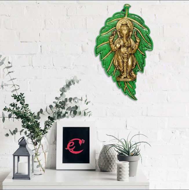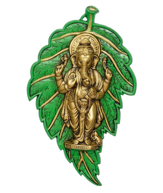 Product Description - Provide your home or office with a regal touch with our Golden Chaturbhuj Lord Ganesha on Green Leaf Metal Wall Hanging which is the best and is going to make the guest's head turn. These religious wall décor items are timeless pieces of art and are intricately made by our skilled artisans using various techniques. These wall decor items also serve as a great gifting option for your friends and family. You can find a variety of wall decor items on our online portal that arrive in different forms. Exquisitely designed and intricately crafted, it makes for a perfect gifting option for friends & family. You can find many more wall hangings in different patterns on our online portal in various colors that suit your home or office interior.