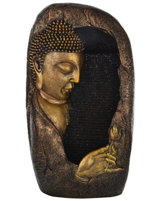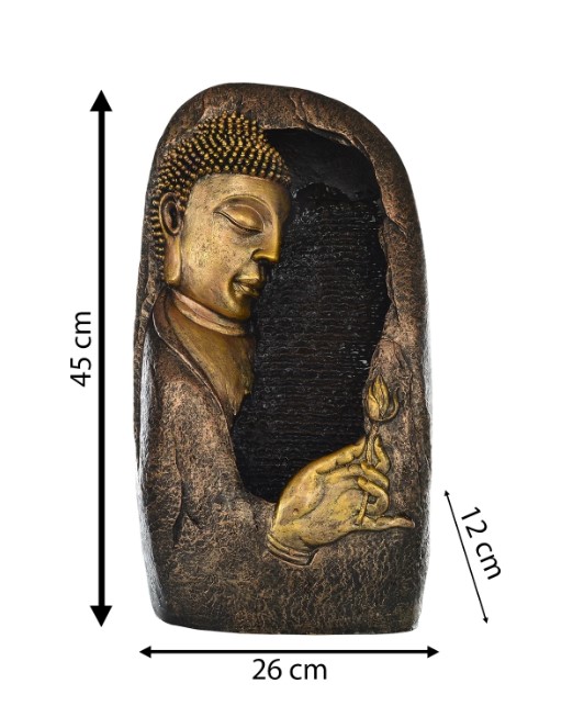 Product Description - So you want a fountain for your home or office or even your meditation/yoga space– you want something pretty, elegant, and attracts just the right amount of attention and positivity. Our Golden polystone premium decorative Buddha water fountain is just what you will want– while the Buddha’s face gives this décor piece the serenity that you might be looking for, the gentle sound of the trickling water will provide you a sense of calm. The design of the fountain is such that it looks like the interior of a cave– Lord Buddha’s face looks longingly at his hand which tries to capture the water that trickles from the top. The lighting adds to the charm as well as a certain level of glamour to the fountain, making this a perfect gifting choice as well! Each water fountain is handcrafted using various ancient techniques by the artisans at the house of and these water fountains are also a great gifting option for your loved ones. Our water fountains have been diligently handcrafted by proficient artisans of who are on a mission to take Indian Art and Culture into each home of India.