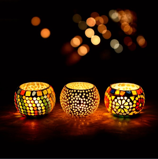 Package Content - One Set of 3 Mosaic Glass Decorative Tea Light Holder/Diya
