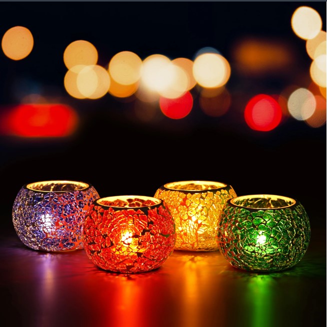 | Package Content - | Purple, Red, Yellow & Green Set of 4 Mosiac Glass Decorative Tea Light Holder/diya |