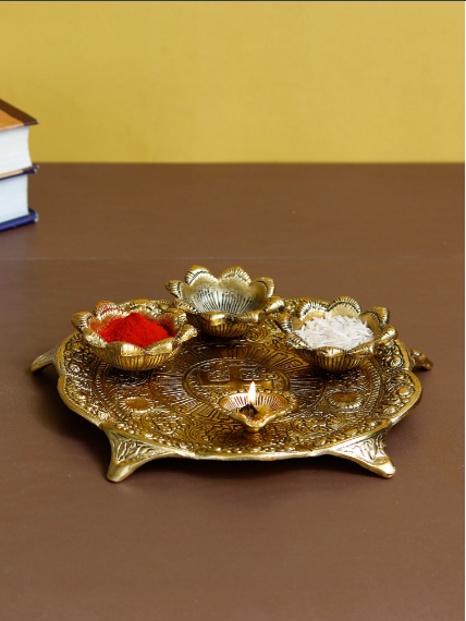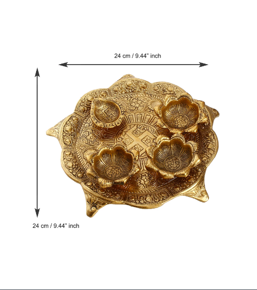 Package Content - One Swastik Golden Metal Pooja Thali with 3 Bowls and 1 Diya