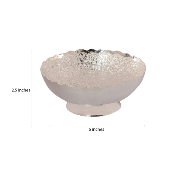 Product Description - To create a royal appearance for your dinner table, offers you this lovely German Silver Decorative Platter coupled with a Royal Velvet box. German Silver products have been in trend for ages now when it comes to gifting your friends & family as they can be viewed as a lovely and sophisticated gift for any occasion. This gorgeous platter has been painstakingly made by hand by talented craftsmen from the company utilizing a variety of age-old methods. Select from our range of German Silver products and make your celebrations even more regal and grand.