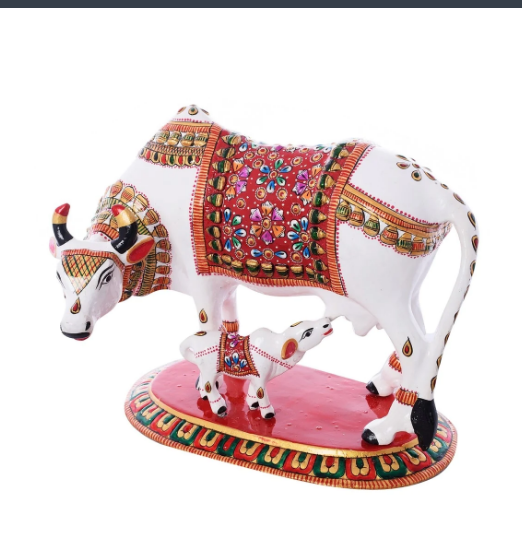 Product Description - The unique creation of meenakari metal white, green and red Kamdhenu cow & calf is an amazing symbol of holyness and culture that has been followed for years now. This figurine showcases the motherly figure of the cow that communicates the sentiments of people with Gaumata. These figurines are the most loved home decoration items that people adore to decorate their home with and also their puja ghar. This can also be a great gift option when you visit your relative's place for a religious function or even for a house warming celebration. These creations are made by experienced artisans at the home of using several antique methods.