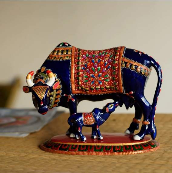 Product Description - The unique creation of meenakari metal blue and red Kamdhenu cow & calf is an amazing symbol of holyness and culture that has been followed for years now. This figurine showcases the motherly figure of the cow that communicates the sentiments of people with Gaumata. These figurines are the most loved home decoration items that people adore to decorate their home with and also their puja ghar. This can also be a great gift option when you visit your relative's place for a religious function or even for a house warming celebration. These creations are made by experienced artisans at the home of using several antique methods.