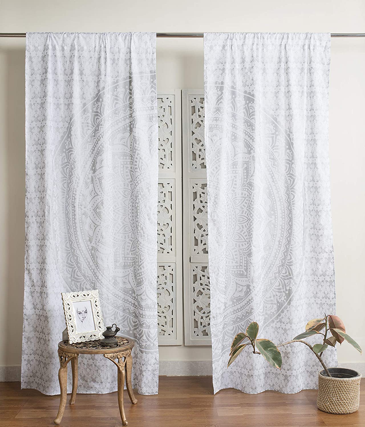 Handmade Cotton Printed Bohemian Mandala Tapestry Balcony Divider Window/ Door Curtain Set for Home (Twin Size, 41 X 82 Inch, Silver and White)