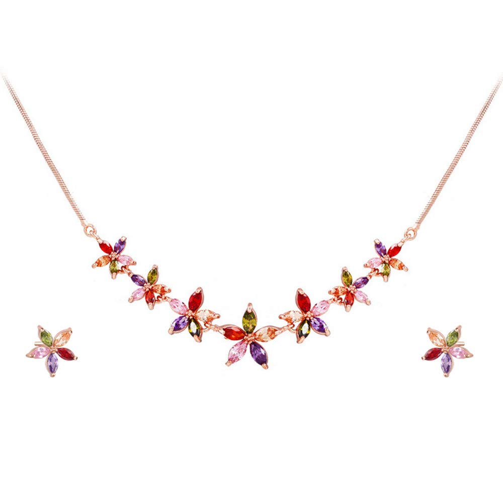 - BEAUTY- This romantic Rose Gold-plated necklace set features a mosaic of vibrant Zircon colors, creating a unique fashion forward look. It is delicately crafted for sober yet elegant looks for a Special evening or occasion, that can be a match with Indian Attire of Western long outfit.This trendy set of jewelry is perfect for gift giving and will enhance any evening outfit.