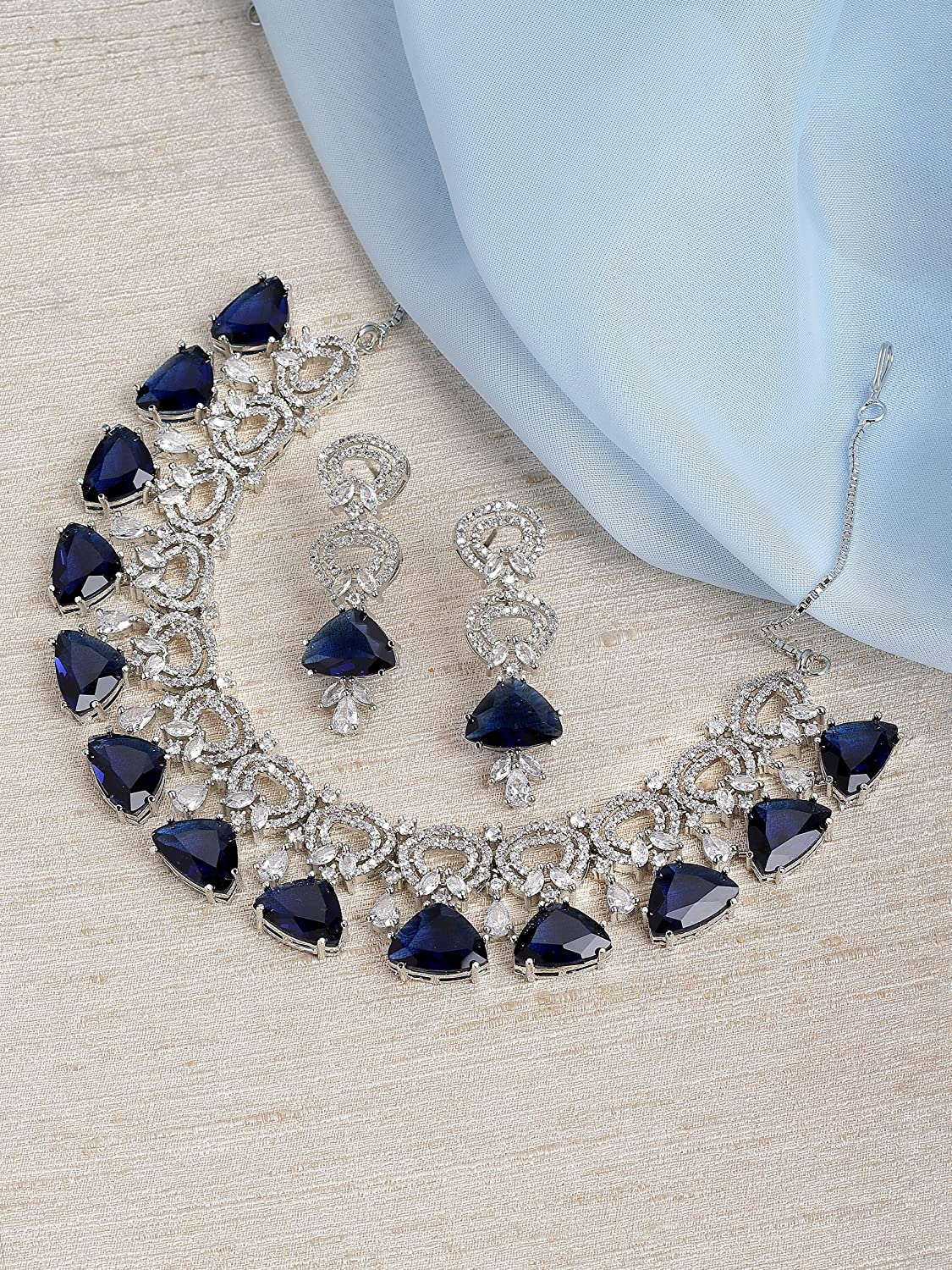 - What you get : 1 N Stylish Elegant American Diamond Studded Necklace with Matching 2 N Earrings From The House Of Zeneme.