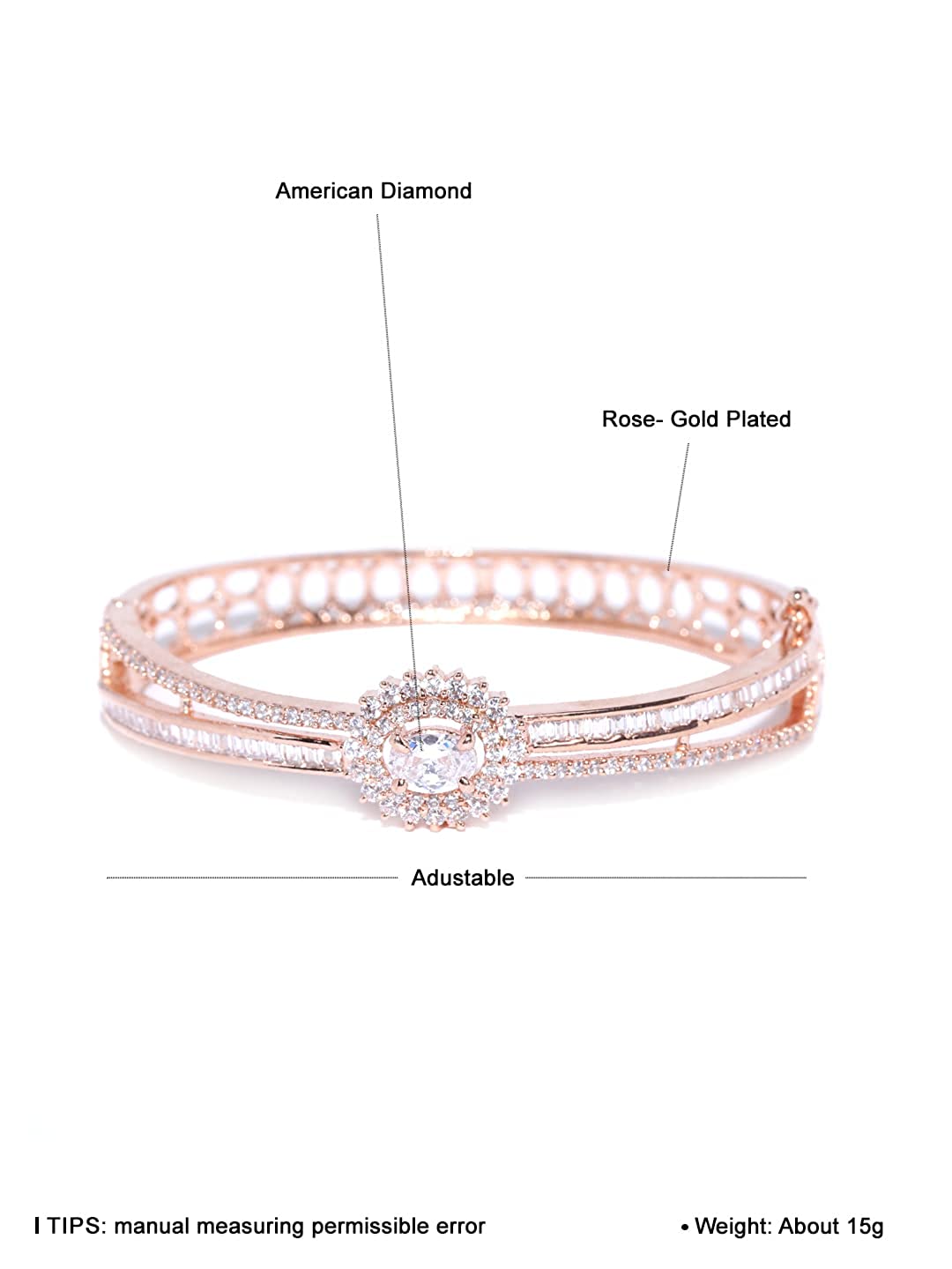 - Color: Rose Gold ; Material: Brass; Gem Type: American Diamond; Size: 2.6 In